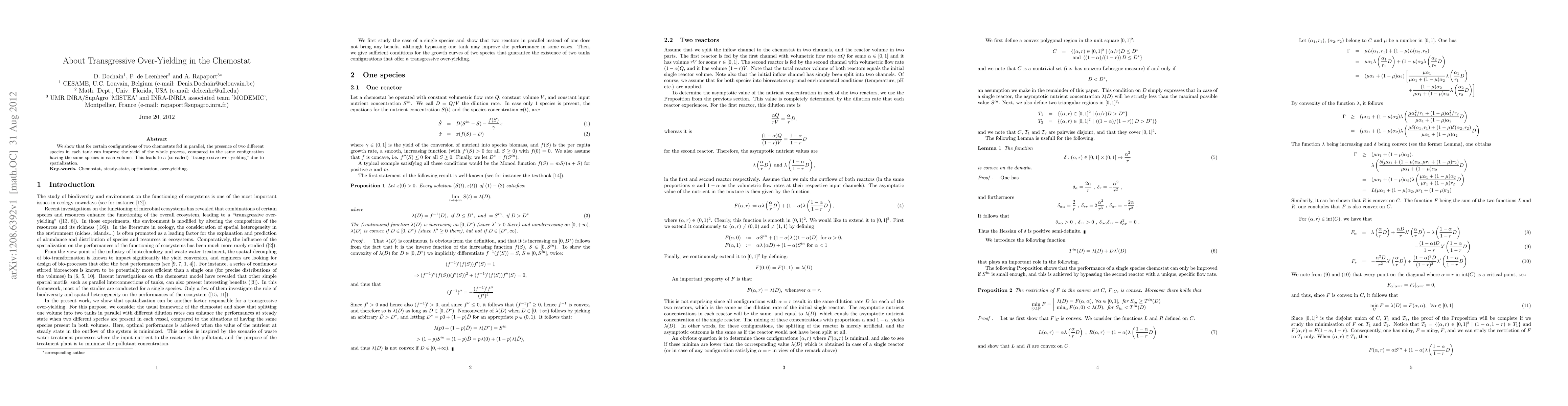 Summary: The study reveals that parallel chemostats with different species in each tank can achieve higher overall yield than identical species configurations, demonstrating "transgressive over-yielding" through spatialization. This phenomenon enhances the efficiency of the biological process.