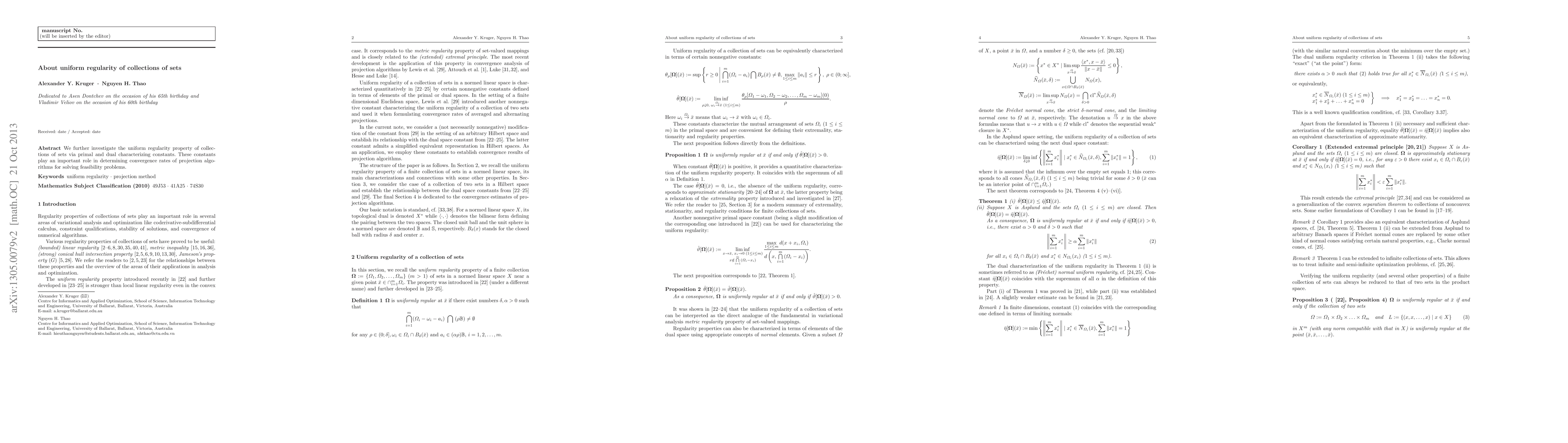 Summary: This paper explores the uniform regularity property of set collections using primal and dual constants, which are crucial for determining the convergence rates of projection algorithms in solving feasibility problems.
