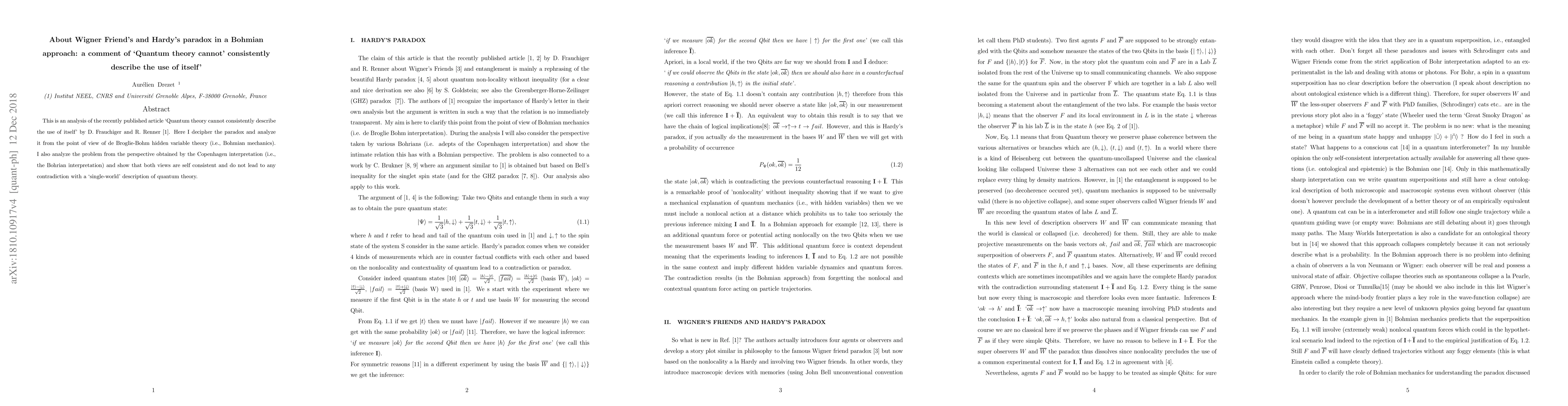 This is an analysis of the recently published article `Quantum theory cannot consistently describe the use of itself' by D. Frauchiger and R. Renner~\cite{1}. Here I decipher the paradox and analyze it from the point of view of de Broglie-Bohm hidden variable theory (i.e., Bohmian mechanics). I also analyze the problem from the perspective obtained by the Copenhagen interpretation (i.e., the Bohrian interpretation) and show that both views are self consistent and do not lead to any contradiction with a `single-world' description of quantum theory.