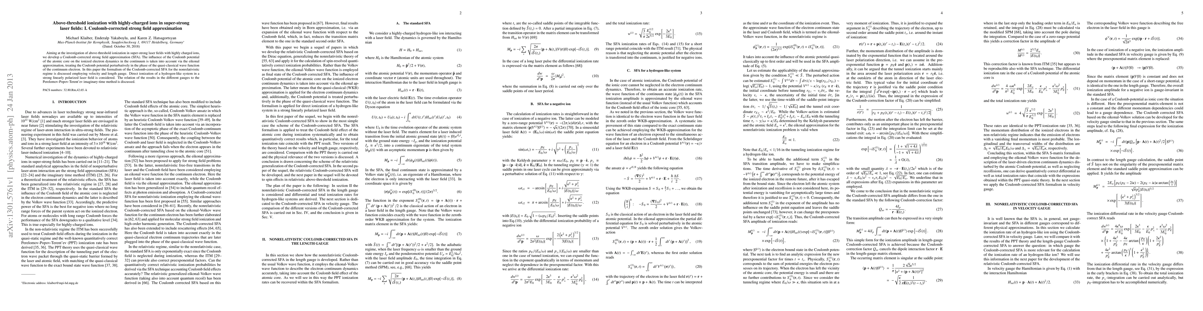 This paper develops a Coulomb-corrected strong field approximation (SFA) to study above-threshold ionization in super-strong laser fields with highly charged ions, taking the atomic core's Coulomb potential into account via the eikonal approximation. It discusses the formalism for the nonrelativistic regime using velocity and length gauges and compares the results to the Perelomov-Popov-Terent'ev method.