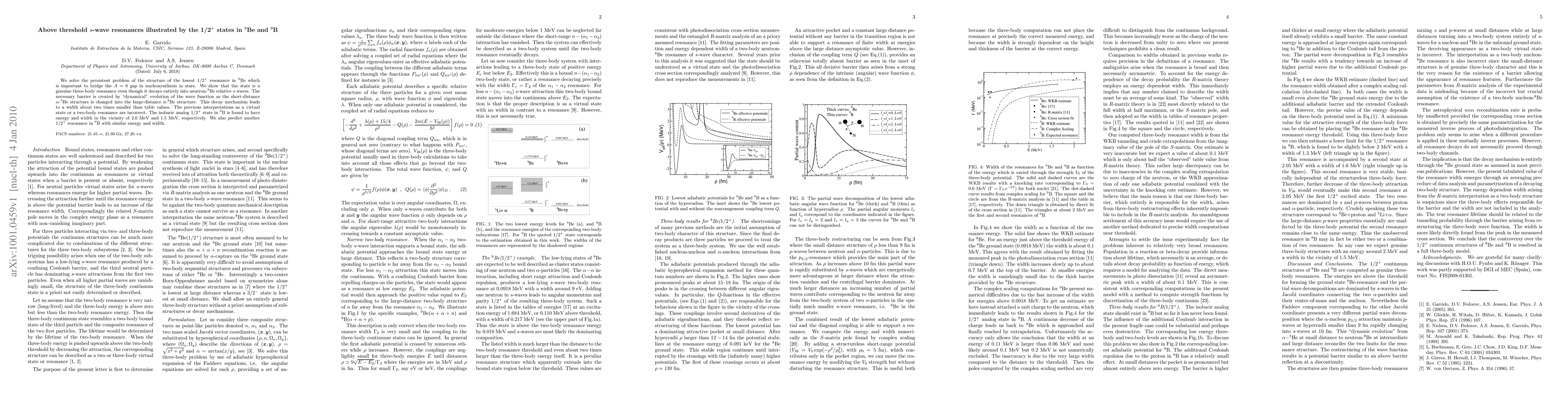 This paper resolves the structure of the lowest $1/2^+$ resonance in $^9$Be, confirming it as a genuine three-body resonance decaying into neutron-$^8$Be relative s-waves, with a significantly smaller width than previously thought. The study also examines the analogous state in $^9$B, predicting similar energy and width for another $1/2^+$ resonance.