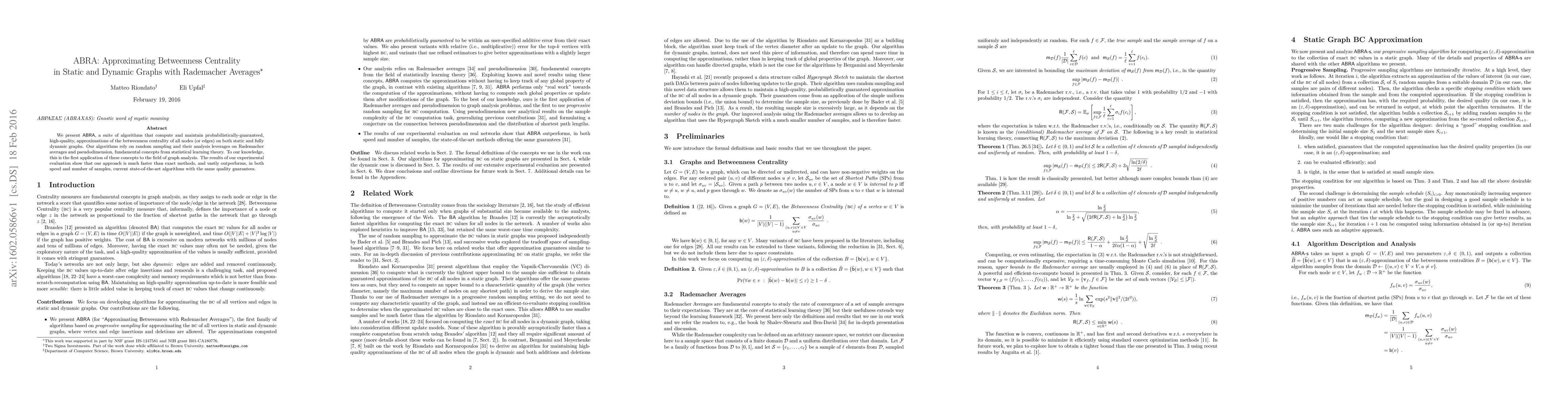 ABRA introduces algorithms for approximating betweenness centrality in static and dynamic graphs using random sampling and Rademacher averages. Experimental results demonstrate significant speed improvements over exact methods and state-of-the-art approximations.
