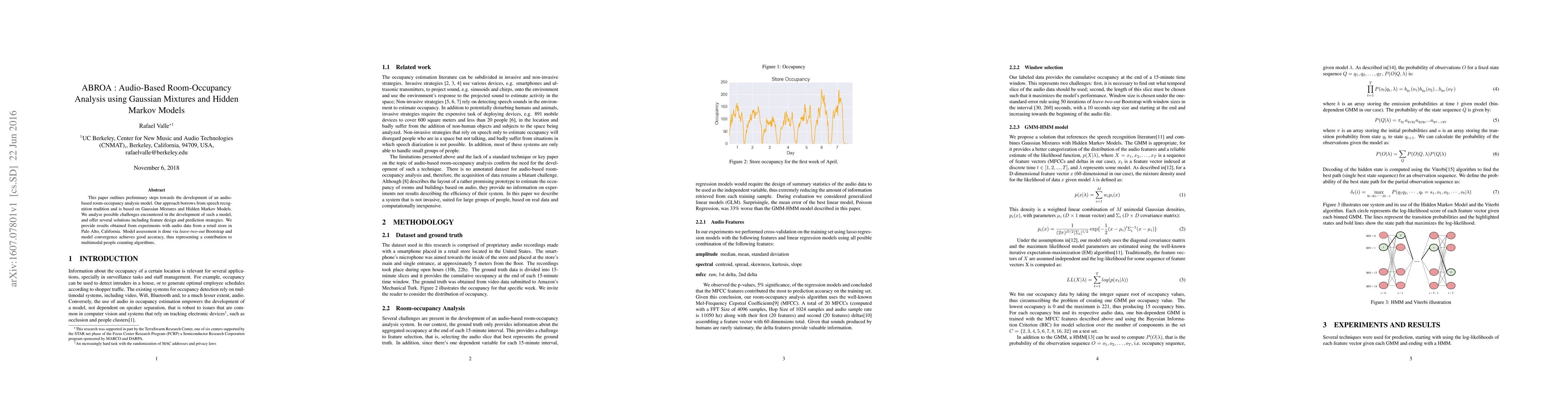 This paper develops an audio-based room-occupancy analysis model using Gaussian Mixtures and Hidden Markov Models, addressing challenges in feature design and prediction strategies. Experiments in a retail store show good accuracy, contributing to multimodal people counting.