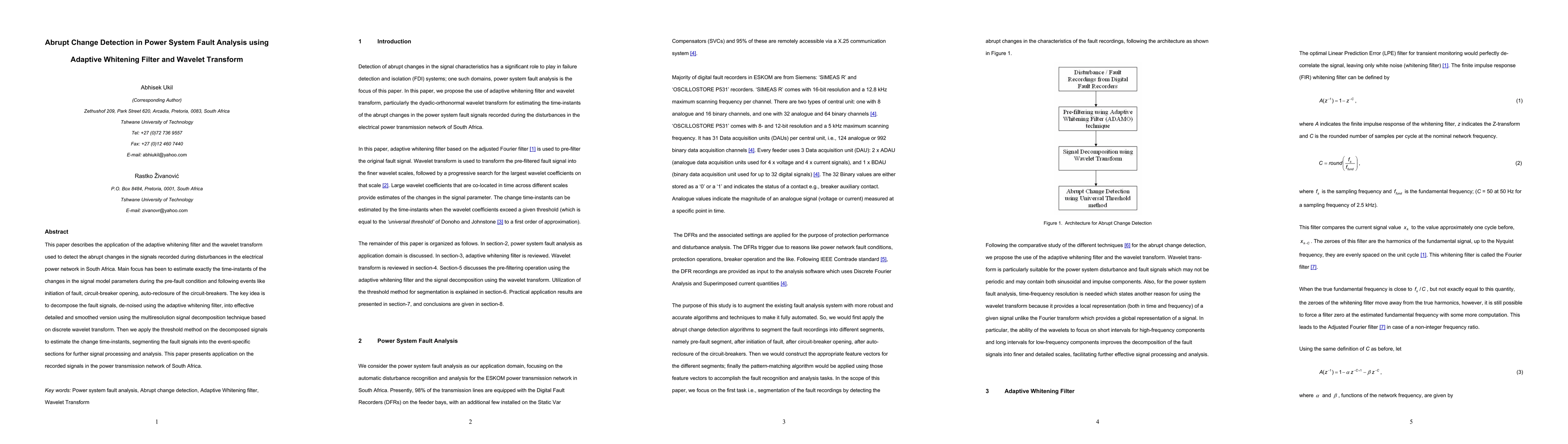 This paper applies an adaptive whitening filter and wavelet transform to detect abrupt changes in power system fault signals in South Africa, focusing on precise time-instant estimation of signal parameter changes during pre-fault and post-fault conditions. The method segments fault signals into event-specific sections for detailed analysis.
