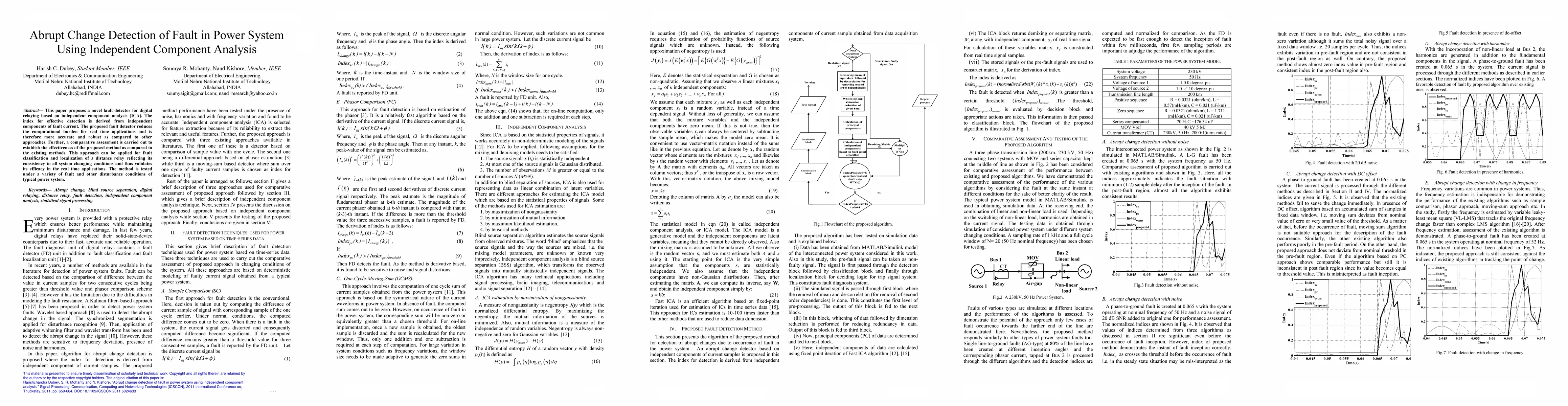 This paper proposes a novel fault detector for digital relaying based on independent component analysis (leA). The index for effective detection is derived from independent components of fault current. The proposed fault detector reduces the computational burden for real time applications and is therefore more accurate and robust as compared to other approaches. Further, a comparative assessment is carried out to establish the effectiveness of the proposed method as compared to the existing methods. This approach can be applied for fault classification and localization of a distance relay reflecting its consistency in all system changing conditions and thus validates its efficacy in the real time applications. The method is tested under a variety of fault and other disturbance conditions of typical power system.