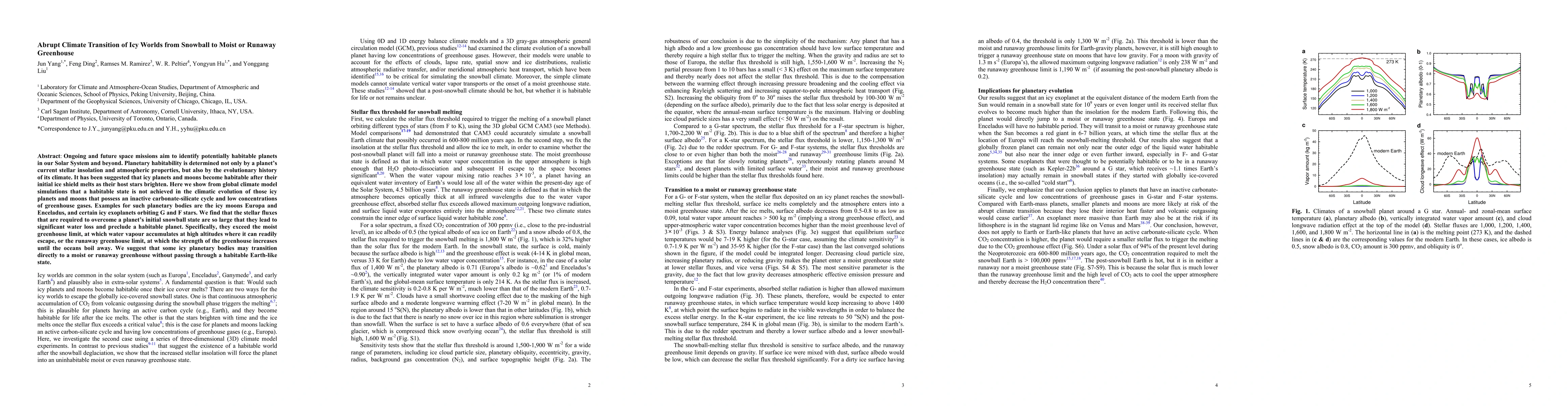 This research demonstrates that icy planets and moons may transition directly from a snowball state to a moist or runaway greenhouse state without achieving a habitable Earth-like state due to high stellar fluxes, leading to significant water loss and preventing habitability. Examples include Europa, Enceladus, and certain icy exoplanets.