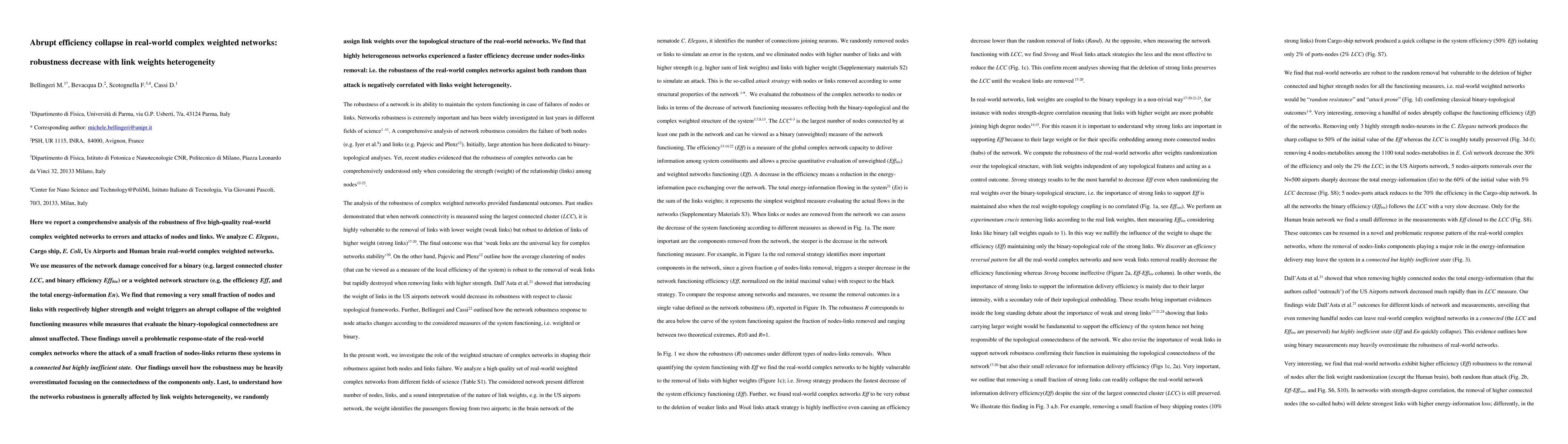 Here we report a comprehensive analysis of the robustness of five high-quality real-world complex weighted networks to errors and attacks of nodes and links. We analyze C. Elegans, Cargo ship, E. Coli, Us Airports and Human brain real-world complex weighted networks. We use measures of the network damage conceived for a binary (e.g. largest connected cluster LCC, and binary efficiency Effbin) or a weighted network structure (e.g. the efficiency Eff, and the total energy-information En). We find that removing a very small fraction of nodes and links with respectively higher strength and weight triggers an abrupt collapse of the weighted functioning measures while measures that evaluate the binary-topological connectedness are almost unaffected. These findings unveil a problematic response-state of the real-world complex networks where the attack of a small fraction of nodes-links returns these systems in a connected but highly inefficient state. Our findings unveil how the robustness may be heavily overestimated focusing on the connectedness of the components only. Last, to understand how the networks robustness is generally affected by link weights heterogeneity, we randomly assign link weights over the topological structure of the real-world networks. We find that highly heterogeneous networks experienced a faster efficiency decrease under nodes-links removal: i.e. the robustness of the real-world complex networks against both random than attack is negatively correlated with links weight heterogeneity.