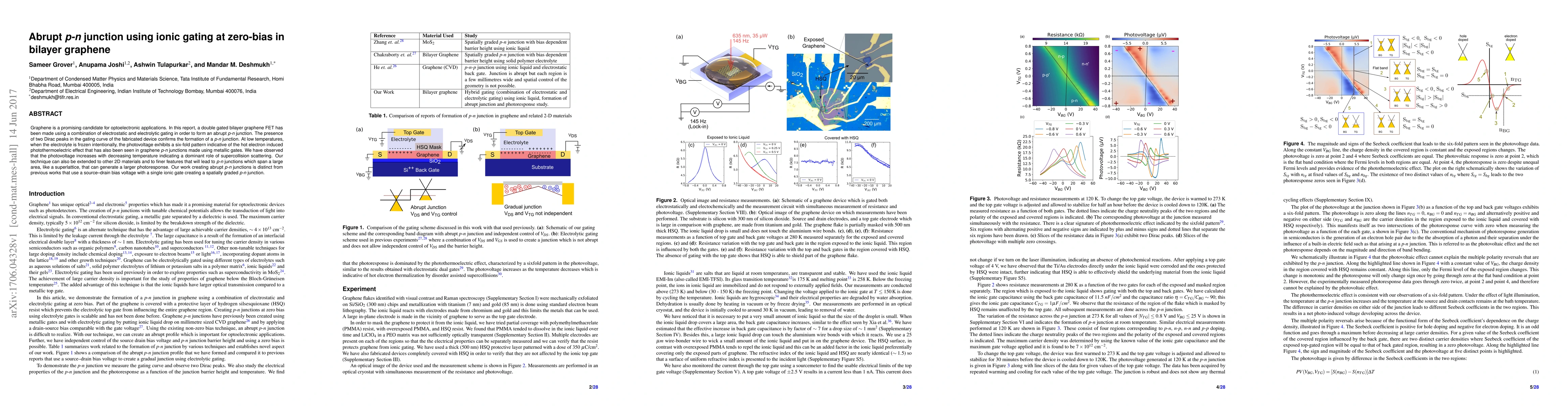 Graphene is a promising candidate for optoelectronic applications. In this report, a double gated bilayer graphene FET has been made using a combination of electrostatic and electrolytic gating in order to form an abrupt p-n junction. The presence of two Dirac peaks in the gating curve of the fabricated device confirms the formation of a p-n junction. At low temperatures, when the electrolyte is frozen intentionally, the photovoltage exhibits a six-fold pattern indicative of the hot electron induced photothermoelectric effect that has also been seen in graphene p-n junctions made using metallic gates. We have observed that the photovoltage increases with decreasing temperature indicating a dominant role of supercollision scattering. Our technique can also be extended to other 2D materials and to finer features that will lead to p-n junctions which span a large area, like a superlattice, that can generate a larger photoresponse. Our work creating abrupt p-n junctions is distinct from previous works that use a source-drain bias voltage with a single ionic gate creating a spatially graded p-n junction.