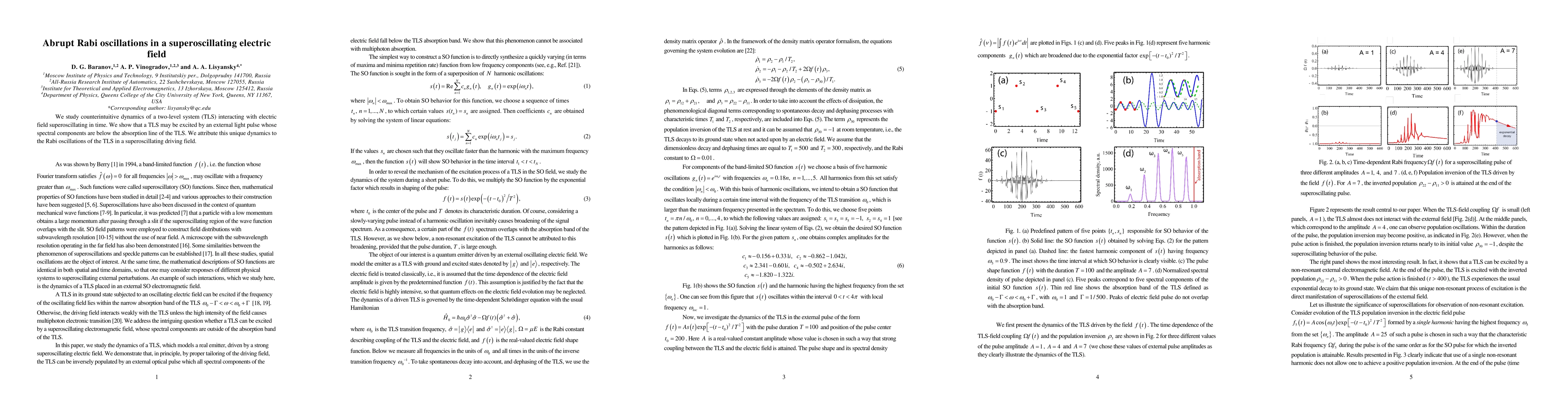 We study counterintuitive dynamics of a two-level system (TLS) interacting with electric field superoscillating in time. We show that a TLS may be excited by an external light pulse whose spectral components are below the absorption line of the TLS. We attribute this unique dynamics to the Rabi oscillations of the TLS in a superoscillating driving field.