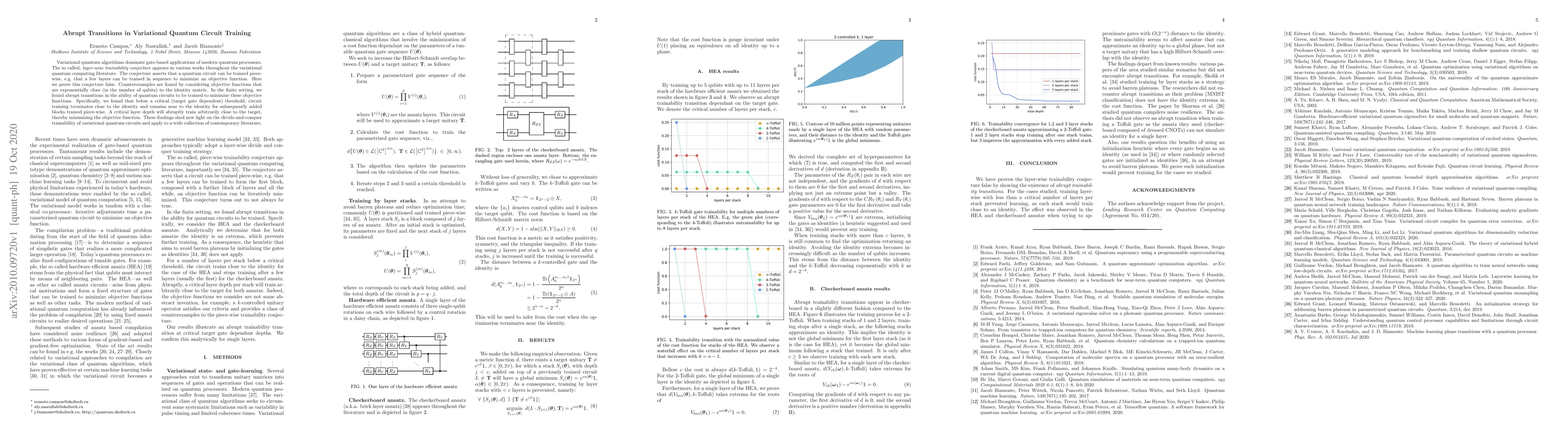This paper disproves the layer-wise trainability conjecture in variational quantum circuits, demonstrating abrupt transitions in training effectiveness below a critical threshold. It reveals that below this threshold, training remains ineffective, while surpassing it allows for effective training to minimize objective functions.