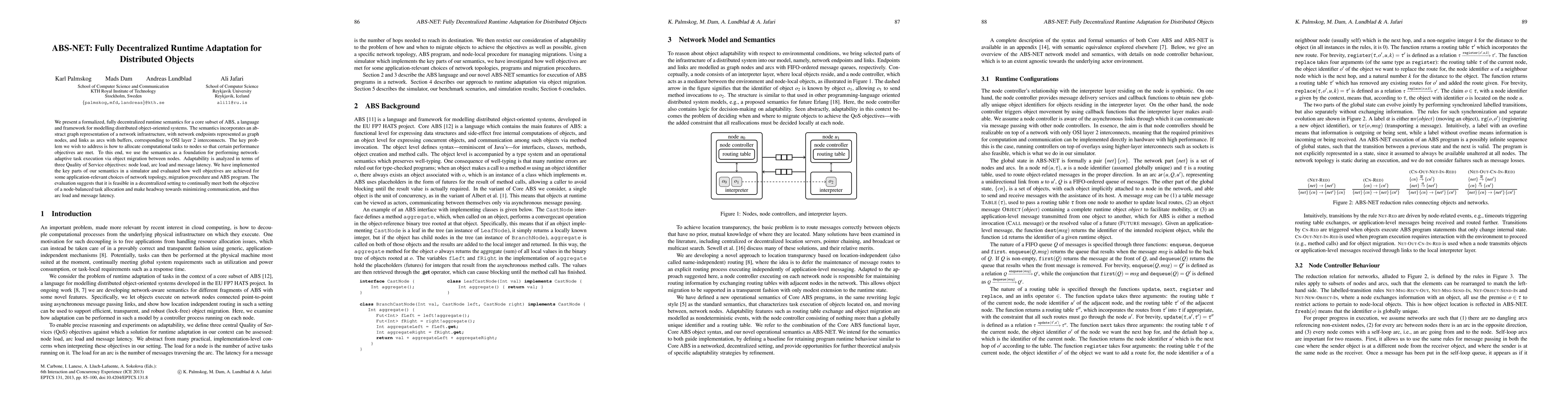 We present a formalized, fully decentralized runtime semantics for a core subset of ABS, a language and framework for modelling distributed object-oriented systems. The semantics incorporates an abstract graph representation of a network infrastructure, with network endpoints represented as graph nodes, and links as arcs with buffers, corresponding to OSI layer 2 interconnects. The key problem we wish to address is how to allocate computational tasks to nodes so that certain performance objectives are met. To this end, we use the semantics as a foundation for performing network-adaptive task execution via object migration between nodes. Adaptability is analyzed in terms of three Quality of Service objectives: node load, arc load and message latency. We have implemented the key parts of our semantics in a simulator and evaluated how well objectives are achieved for some application-relevant choices of network topology, migration procedure and ABS program. The evaluation suggests that it is feasible in a decentralized setting to continually meet both the objective of a node-balanced task allocation and make headway towards minimizing communication, and thus arc load and message latency.