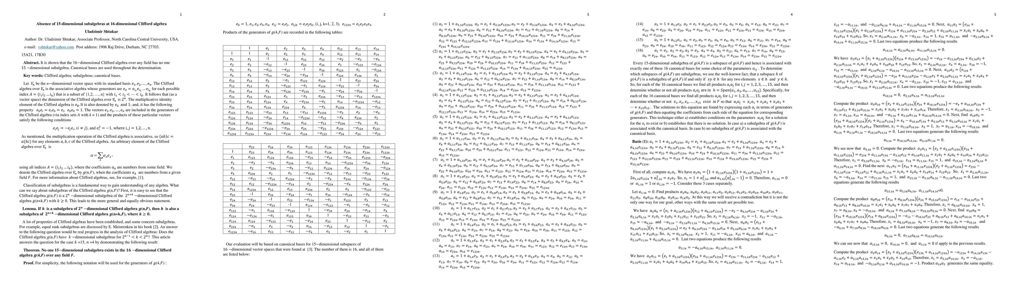 It is shown that the 16-dimensional Clifford algebra over any field has no one 15-dimensional subalgebra. Canonical bases are used throughout the determination.
