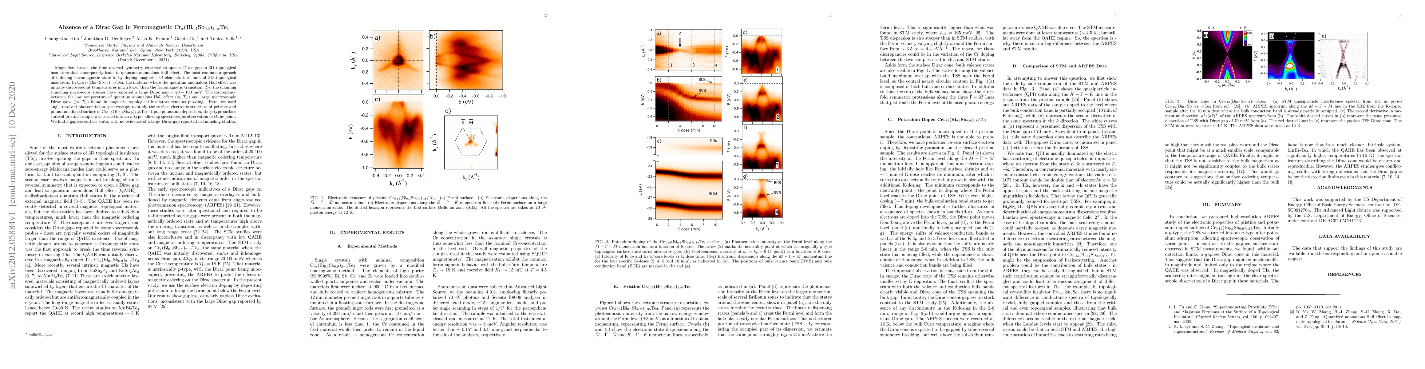 Magnetism breaks the time reversal symmetry expected to open a Dirac gap in 3D topological insulators that consequently leads to quantum anomalous Hall effect. The most common approach of inducing ferromagnetic state is by doping magnetic 3$d$ elements into bulk of 3D topological insulators. In Cr$_{0.15}$(Bi$_{0.1}$Sb$_{0.9}$)$_{1.85}$Te$_3$, the material where the quantum anomalous Hall effect was initially discovered at temperatures much lower than the ferromagnetic transition, $T_C$, the scanning tunneling microscopy studies have reported a large Dirac gap $\sim20-100$ meV. The discrepancy between the low temperature of quantum anomalous Hall effect ($\ll T_C$) and large spectroscopic Dirac gaps ($\gg T_C$) found in magnetic topological insulators remains puzzling. Here, we used angle-resolved photoemission spectroscopy to study the surface electronic structure of pristine and potassium doped surface of Cr$_{0.15}$(Bi$_{0.1}$Sb$_{0.9}$)$_{1.85}$Te$_3$. Upon potassium deposition, the $p$-type surface state of pristine sample was turned into an $n$-type, allowing spectroscopic observation of Dirac point. We find a gapless surface state, with no evidence of a large Dirac gap reported in tunneling studies.
