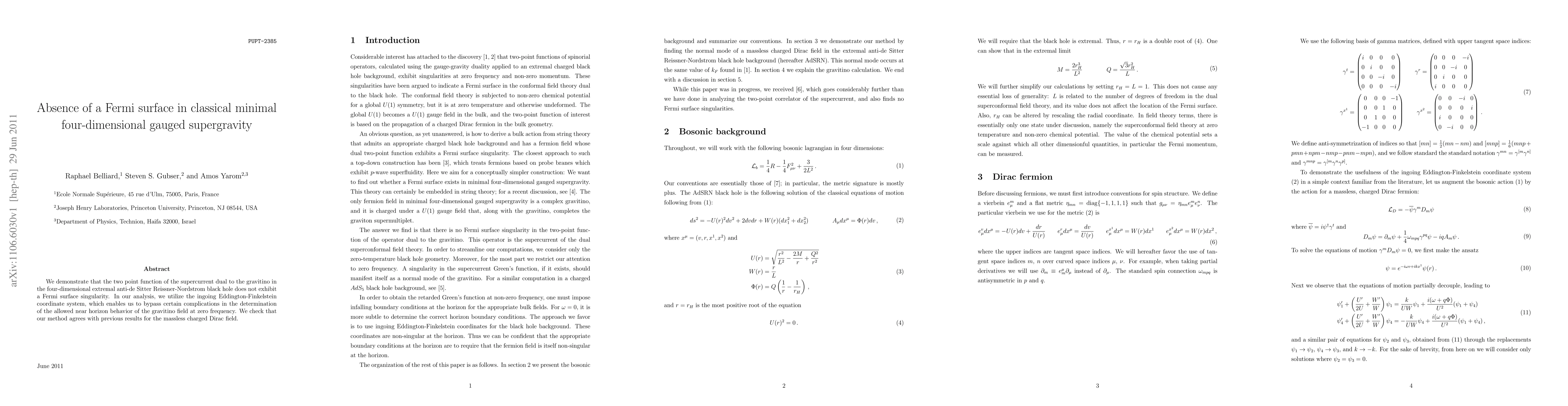 We demonstrate that the two point function of the supercurrent dual to the gravitino in the four-dimensional extremal anti-de Sitter Reissner-Nordstrom black hole does not exhibit a Fermi surface singularity. In our analysis, we utilize the ingoing Eddington-Finkelstein coordinate system, which enables us to bypass certain complications in the determination of the allowed near horizon behavior of the gravitino field at zero frequency. We check that our method agrees with previous results for the massless charged Dirac field.