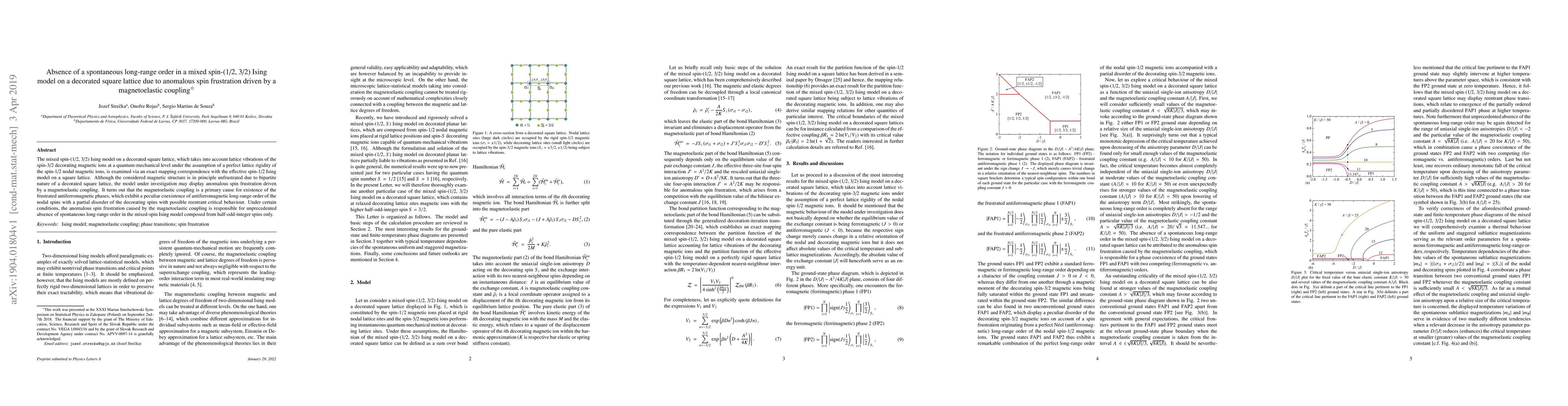 This paper investigates the absence of spontaneous long-range order in a mixed spin-(1/2, 3/2) Ising model on a decorated square lattice, revealing that anomalous spin frustration driven by magnetoelastic coupling leads to frustrated antiferromagnetic phases and prevents long-range order.