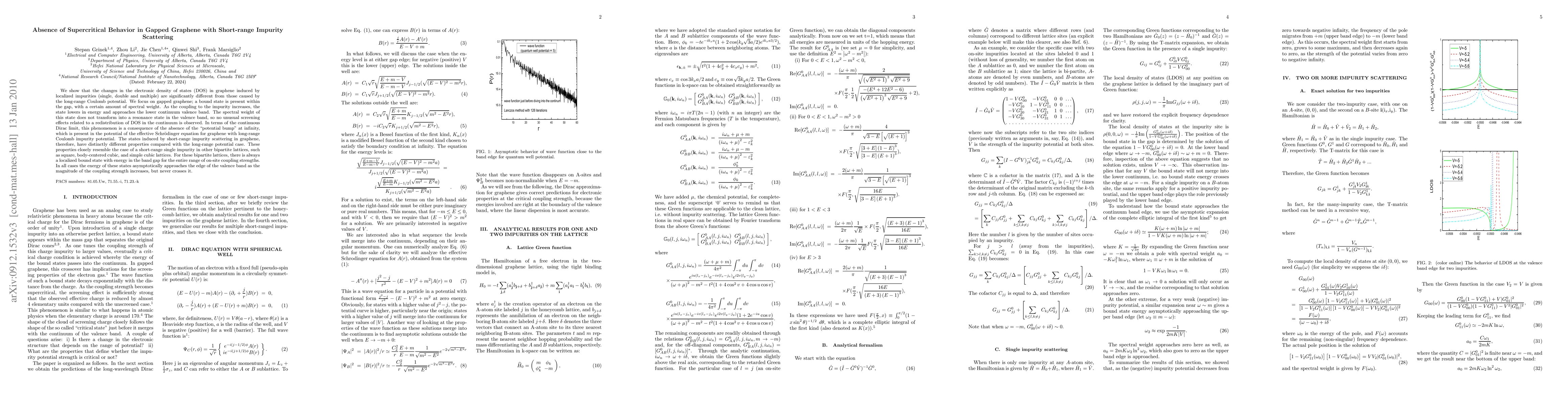 This paper demonstrates that short-range impurity scattering in gapped graphene does not induce a supercritical regime, unlike long-range Coulomb potential scattering, and lacks unusual screening effects due to the absence of resonance states. The behavior of states induced by short-range impurities mirrors that of other bipartite lattices.