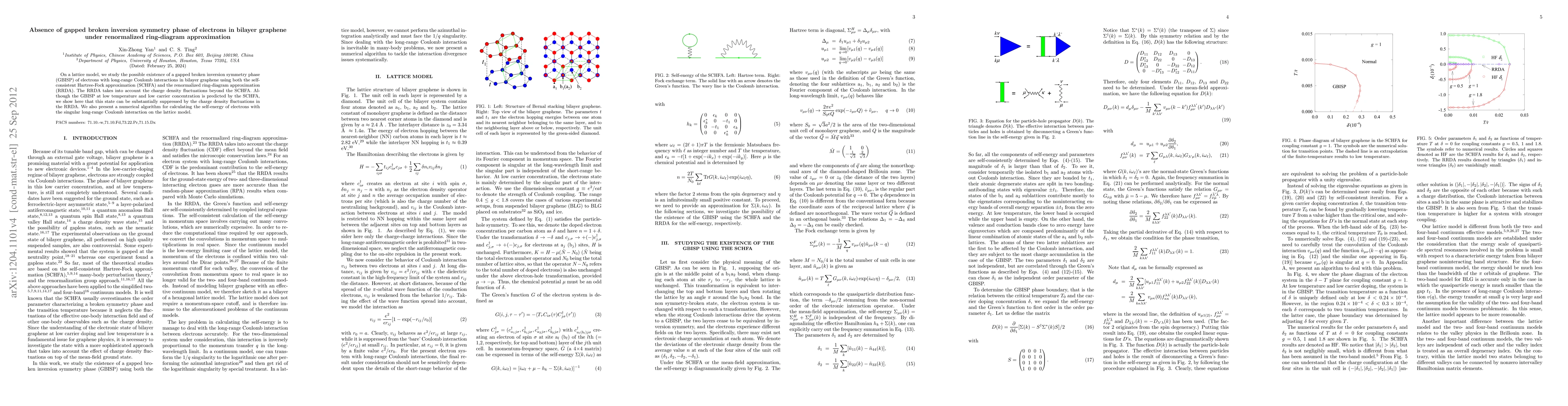 On a lattice model, we study the possibility of existence of gapped broken inversion symmetry phase (GBISP) of electrons with long-range Coulomb interaction in bilayer graphene using both self-consistent Hartree-Fock approximation (SCHFA) and the renormalized-ring-diagram approximation (RRDA). RRDA takes into account the charge-density fluctuations beyond the mean field. While GBISP at low temperature and low carrier concentration is predicted by SCHFA, we show here the state can be destroyed by the charge-density fluctuations. We also present a numerical algorithm for calculating the self-energy of electrons with the singular long-range Coulomb interaction on the lattice model.