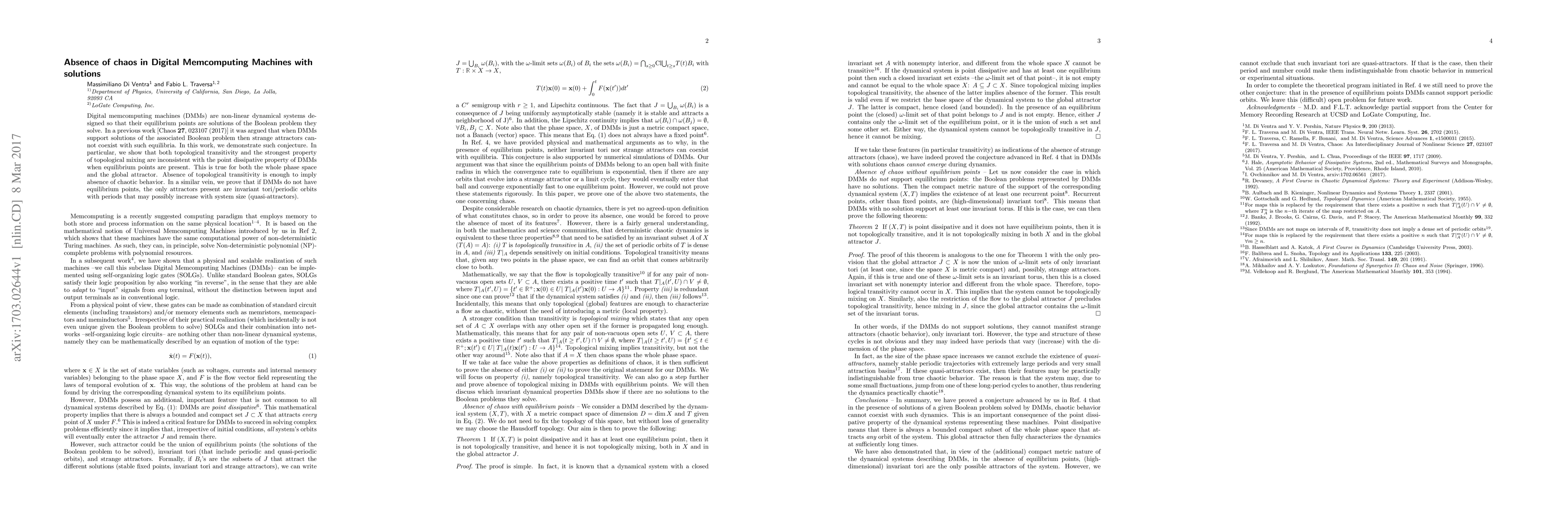 Digital memcomputing machines (DMMs) are non-linear dynamical systems designed so that their equilibrium points are solutions of the Boolean problem they solve. In a previous work [Chaos 27, 023107 (2017)] it was argued that when DMMs support solutions of the associated Boolean problem then strange attractors cannot coexist with such equilibria. In this work, we demonstrate such conjecture. In particular, we show that both topological transitivity and the strongest property of topological mixing are inconsistent with the point dissipative property of DMMs when equilibrium points are present. This is true for both the whole phase space and the global attractor. Absence of topological transitivity is enough to imply absence of chaotic behavior. In a similar vein, we prove that if DMMs do not have equilibrium points, the only attractors present are invariant tori/periodic orbits with periods that may possibly increase with system size (quasi-attractors).