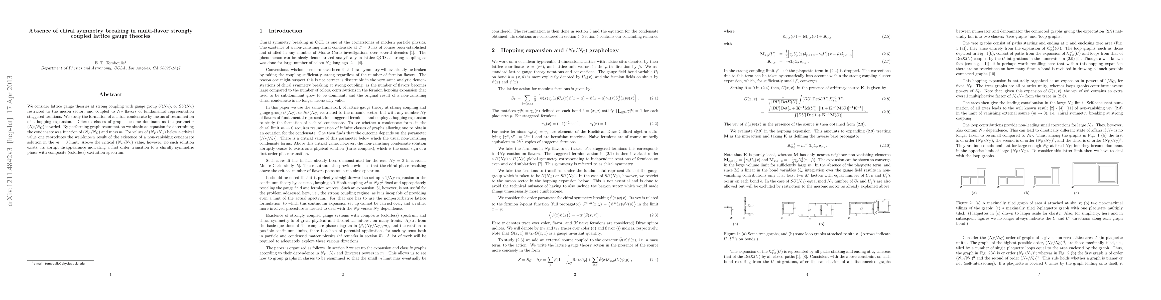 We consider lattice gauge theories at strong coupling with gauge group $U(N_C)$, or $SU(N_C)$ restricted to the meson sector, and coupled to $N_F$ flavors of fundamental representation staggered fermions. We study the formation of a chiral condensate by means of resummation of a hopping expansion. Different classes of graphs become dominant as the parameter $(N_F/N_C)$ is varied. By performing graph resummation we obtain an equation for determining the condensate as a function of $(N_F/N_C)$ and mass $m$. For values of $(N_F/N_C)$ below a critical value one reproduces the well-known result of the existence of a non-vanishing condensate solution in the $m=0$ limit. Above the critical $(N_F/N_C)$ value, however, no such solution exists, its abrupt disappearance indicating a first order transition to a chirally symmetric phase with composite (colorless) excitation spectrum.