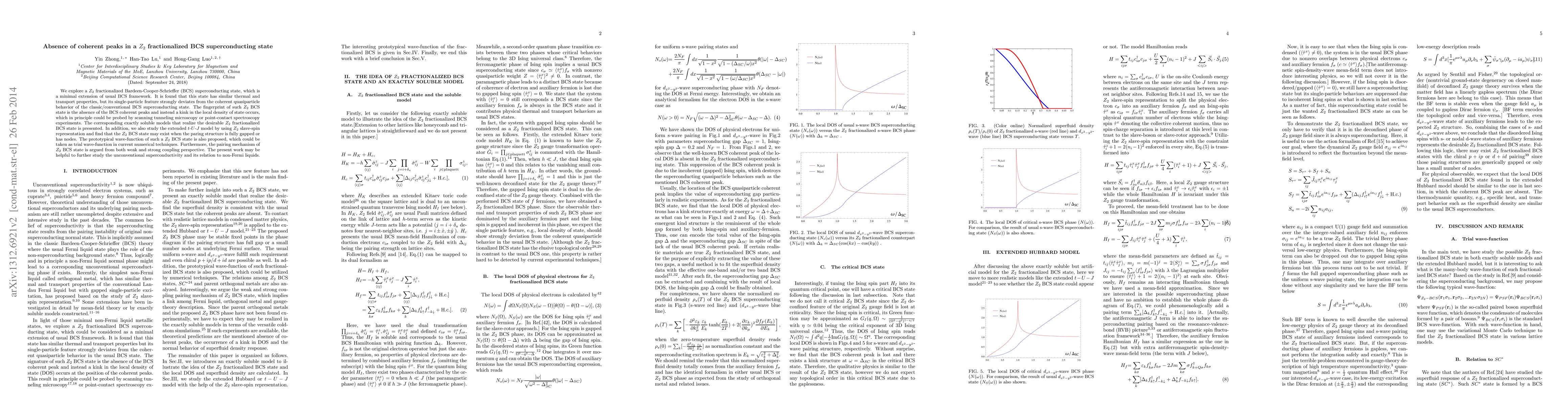 This paper investigates a $Z_{2}$ fractionalized BCS superconducting state, discovering that it lacks coherent quasiparticle peaks typically found in conventional BCS states. Instead, it exhibits a kink in the local density of states, potentially detectable via scanning tunneling microscopy, highlighting the state's unconventional characteristics and proposing models and wave-functions for further exploration of unconventional superconductivity.