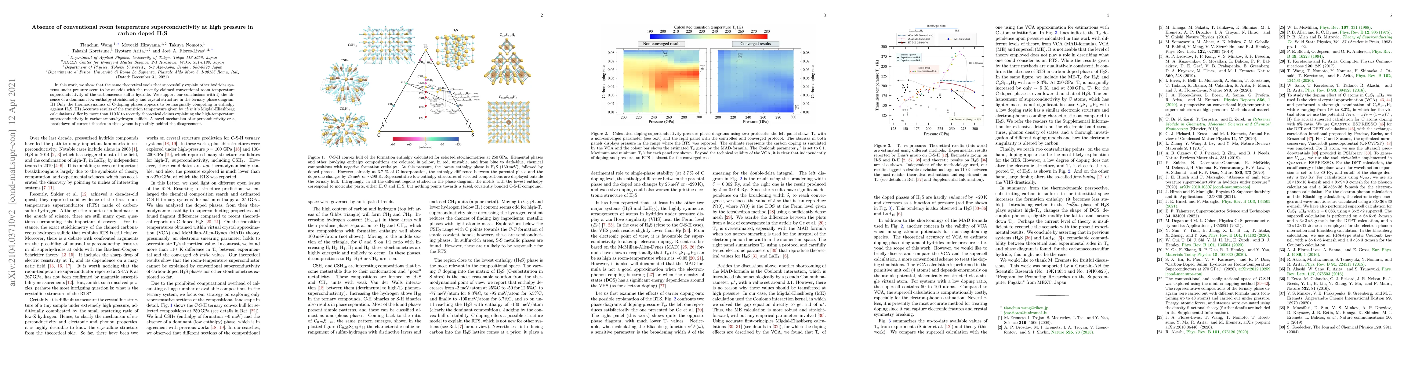 This research refutes the claim of conventional room temperature superconductivity in carbon-doped H$_3$S, finding no dominant low-enthalpy structure and significant discrepancies in calculated transition temperatures compared to previous claims, suggesting a need for a new superconductivity mechanism or a theoretical breakdown.