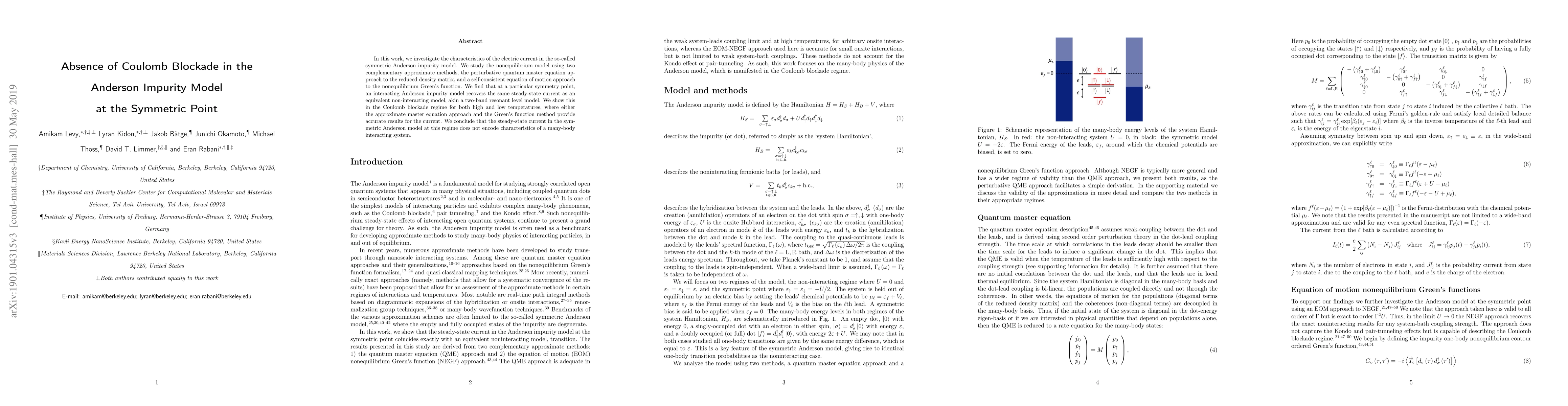 Summary: This research finds that at the symmetric point, the Anderson impurity model exhibits the same steady-state current as a non-interacting model, indicating the absence of Coulomb blockade effects in this regime, regardless of temperature. Both perturbative and self-consistent methods confirm these findings.