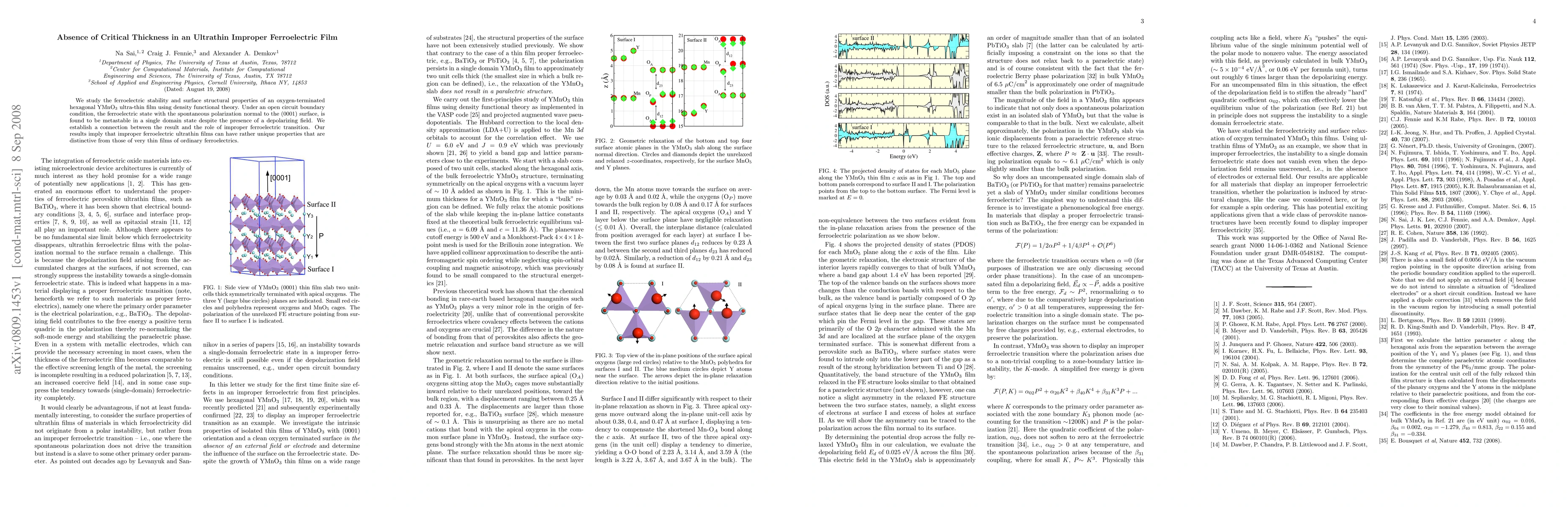 We study the ferroelectric stability and surface structural properties of an oxygen-terminated hexagonal YMnO$_3$ ultra-thin film using density functional theory. Under an open circuit boundary condition, the ferroelectric state with the spontaneous polarization normal to the (0001) surface, is found to be metastable in a single domain state despite the presence of a depolarizing field. We establish a connection between the result and the role of improper ferroelectric transition. Our results imply that improper ferroelectric ultrathin films can have rather unique properties that are distinctive from those of very thin films of ordinary ferroelectrics.