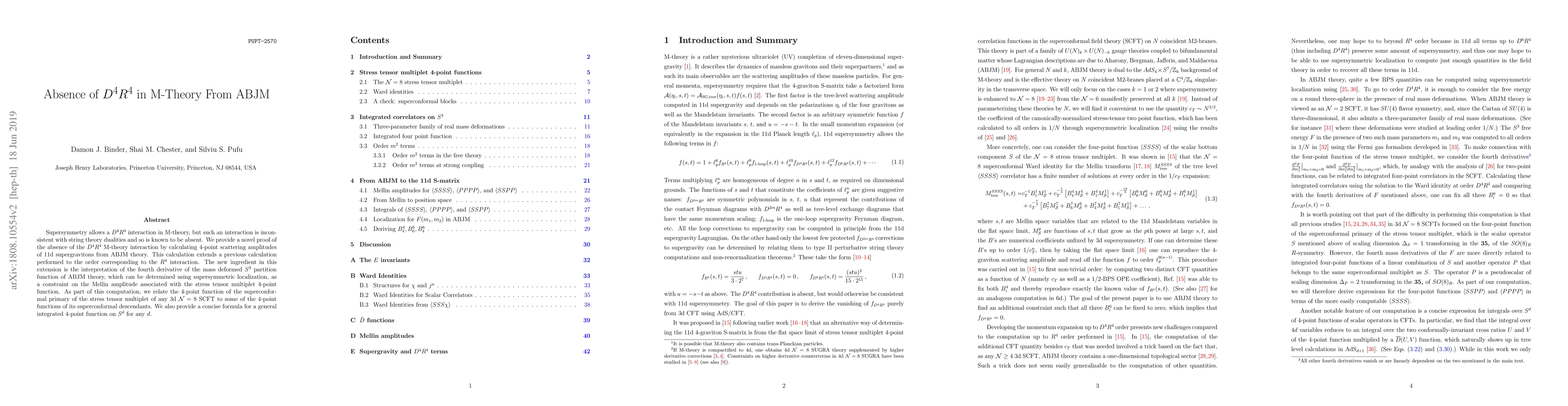 Supersymmetry allows a $D^4 R^4$ interaction in M-theory, but such an interaction is inconsistent with string theory dualities and so is known to be absent. We provide a novel proof of the absence of the $D^4 R^4$ M-theory interaction by calculating 4-point scattering amplitudes of 11d supergravitons from ABJM theory. This calculation extends a previous calculation performed to the order corresponding to the $R^4$ interaction. The new ingredient in this extension is the interpretation of the fourth derivative of the mass deformed $S^3$ partition function of ABJM theory, which can be determined using supersymmetric localization, as a constraint on the Mellin amplitude associated with the stress tensor multiplet 4-point function. As part of this computation, we relate the 4-point function of the superconformal primary of the stress tensor multiplet of any 3d ${\cal N} = 8$ SCFT to some of the 4-point functions of its superconformal descendants. We also provide a concise formula for a general integrated 4-point function on $S^d$ for any $d$.