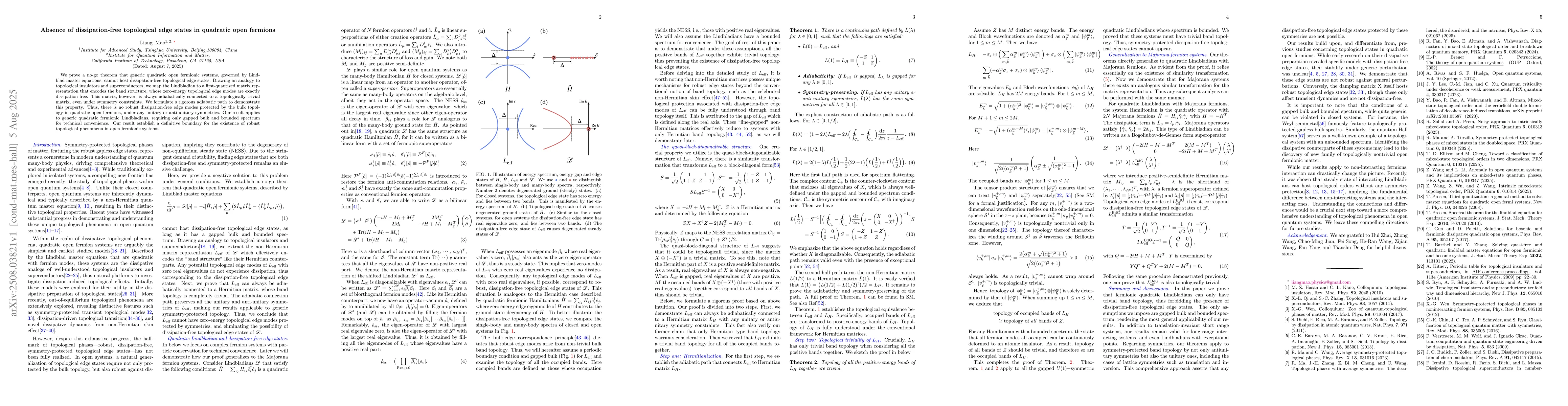 The paper presents a formal proof of a no-go theorem, demonstrating the topological triviality of quadratic open fermionic systems under Lindbladian evolution, and provides a rigorous adiabatic path connecting the non-Hermitian effective matrix to a Hermitian one.