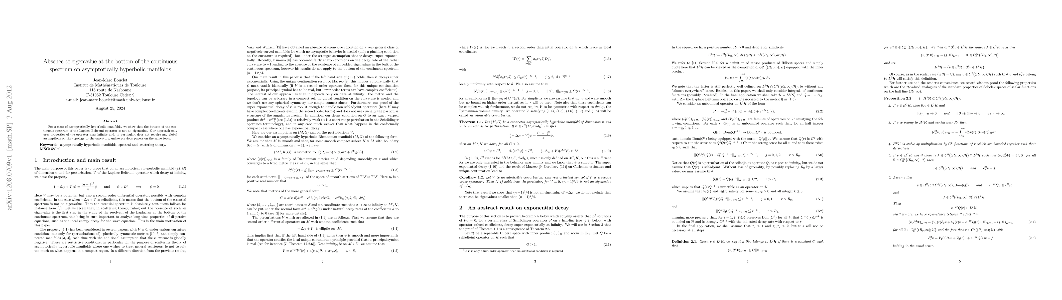 Summary: This paper demonstrates that the Laplace-Beltrami operator on certain asymptotically hyperbolic manifolds does not have an eigenvalue at the bottom of its continuous spectrum, relying solely on local properties near infinity without global topological or curvature assumptions.