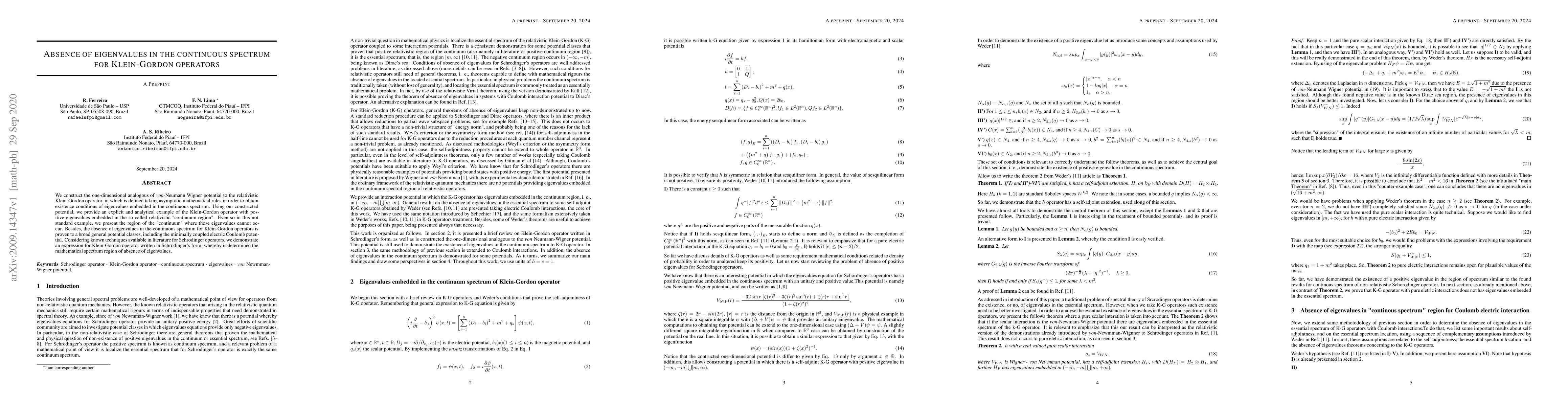 We construct the one-dimensional analogous of von-Neumann Wigner potential to the relativistic Klein-Gordon operator, in which is defined taking asymptotic mathematical rules in order to obtain existence conditions of eigenvalues embedded in the continuous spectrum. Using our constructed potential, we provide an explicit and analytical example of the Klein-Gordon operator with positive eigenvalues embedded in the so called relativistic "continuum region". Even so in this not standard example, we present the region of the "continuum" where those eigenvalues cannot occur. Besides, the absence of eigenvalues in the continuous spectrum for Klein-Gordon operators is proven to a broad general potential classes, including the minimally coupled electric Coulomb potential. Considering known techniques available in literature for Schrodinger operators, we demonstrate an expression for Klein-Gordon operator written in Schrodinger's form, whereby is determined the mathematical spectrum region of absence of eigenvalues.