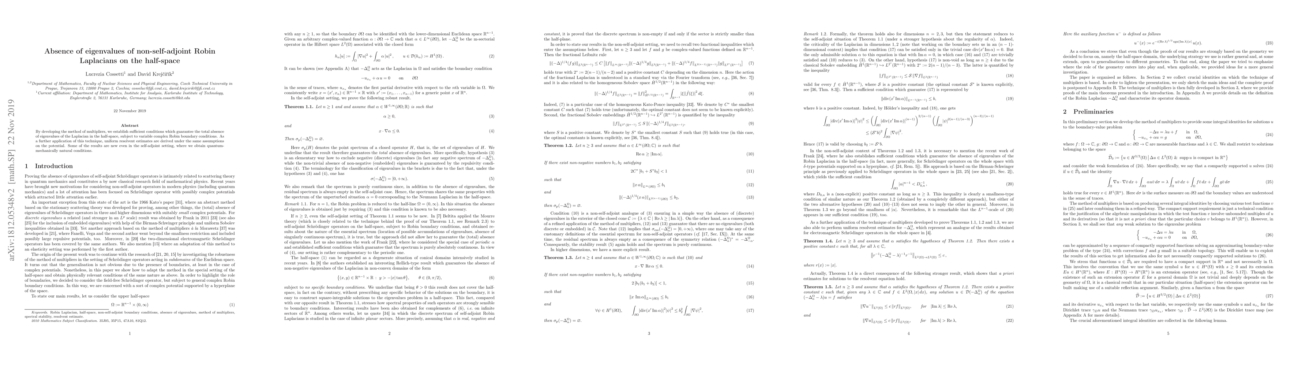This paper develops the method of multipliers to establish conditions ensuring no eigenvalues exist for the non-self-adjoint Robin Laplacian on a half-space, with variable complex boundary conditions. It also derives uniform resolvent estimates under similar assumptions, with some findings novel even in the self-adjoint context.