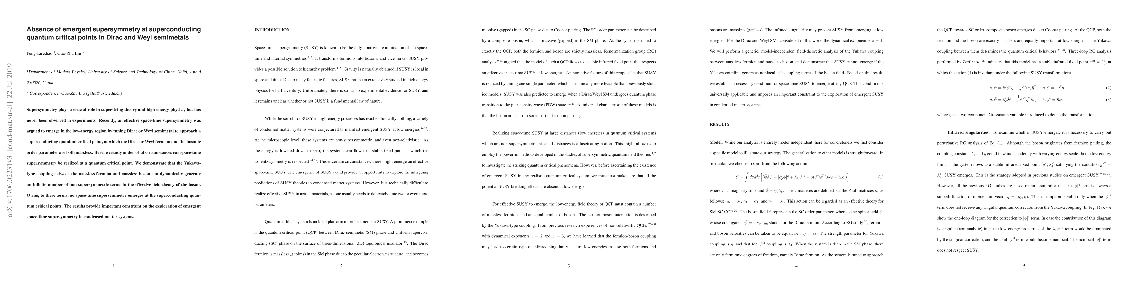 This paper explores the potential for emergent supersymmetry at superconducting quantum critical points in Dirac and Weyl semimetals, finding that Yukawa-type coupling generates non-supersymmetric terms, thus preventing the emergence of space-time supersymmetry. These findings impose significant constraints on the search for such emergent supersymmetry in condensed matter systems.