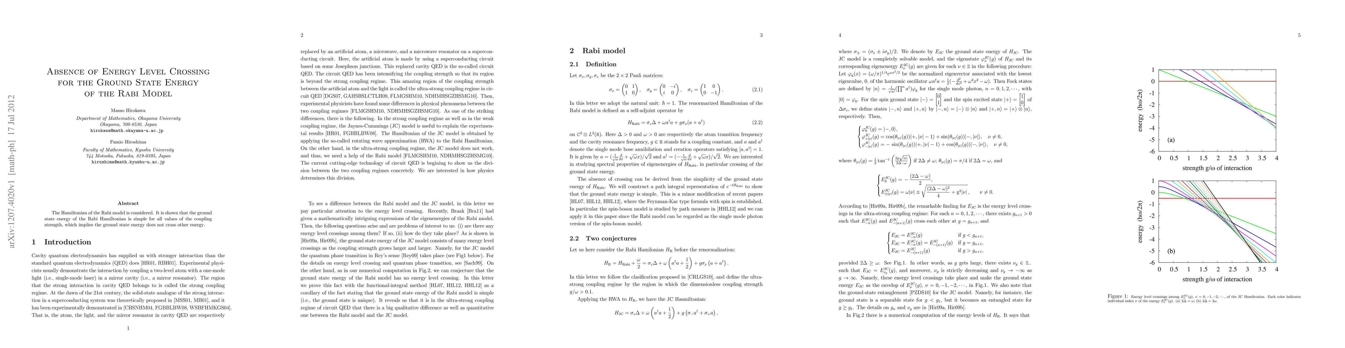 Summary: The study demonstrates that the ground state energy of the Rabi model remains simple and does not cross with other energy levels for any coupling strength, indicating a stable ground state across varying interactions.