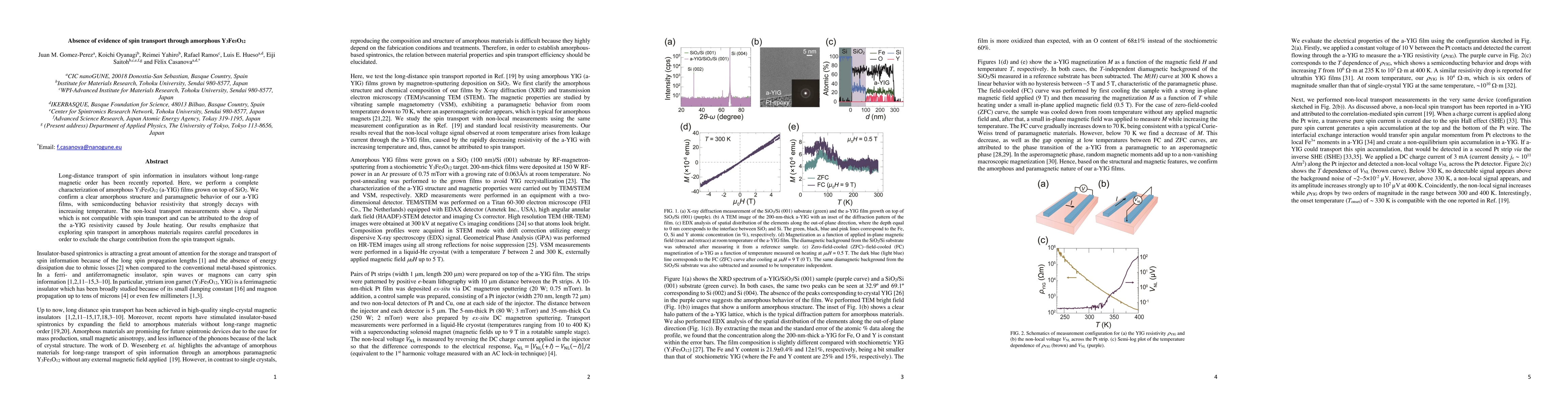 This paper investigates spin transport in amorphous Y$_3$Fe$_5$O$_{12}$ (a-YIG) films, confirming their amorphous structure and paramagnetic behavior. Non-local transport measurements reveal no evidence of spin transport, attributing observed signals to Joule heating effects rather than spin dynamics.