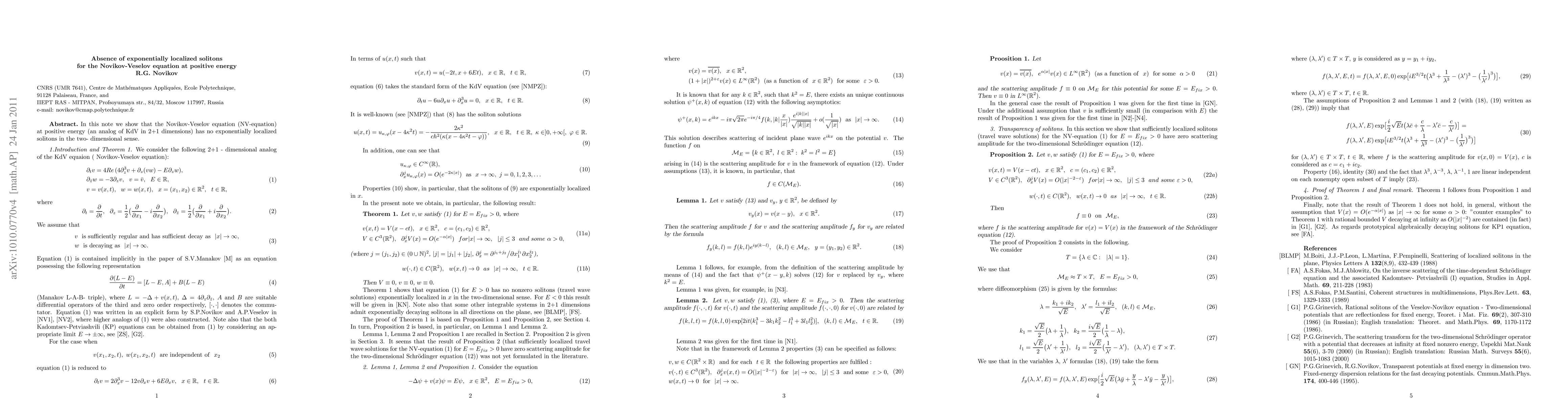 Summary: The research paper demonstrates that the Novikov-Veselov equation, a 2+1 dimensional analog of the KdV equation, does not support exponentially localized solitons at positive energy levels. This finding highlights a significant difference in soliton behavior compared to its 1+1 dimensional counterpart.