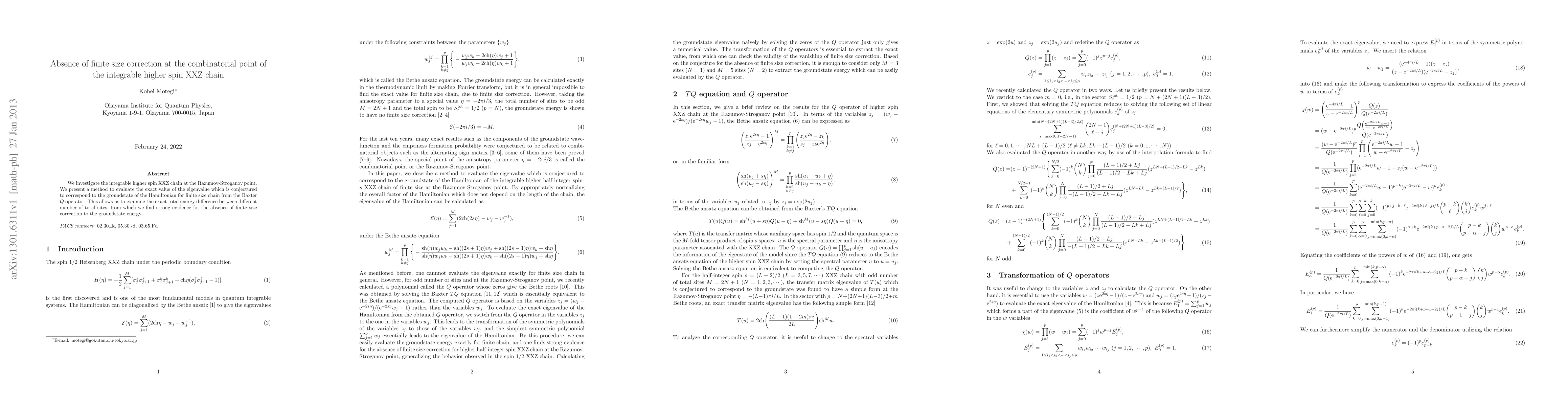 This paper examines the integrable higher spin XXZ chain at the Razumov-Stroganov point, demonstrating that the exact eigenvalue from the Baxter Q operator indicates no finite size correction to the groundstate energy, providing strong evidence for this absence.