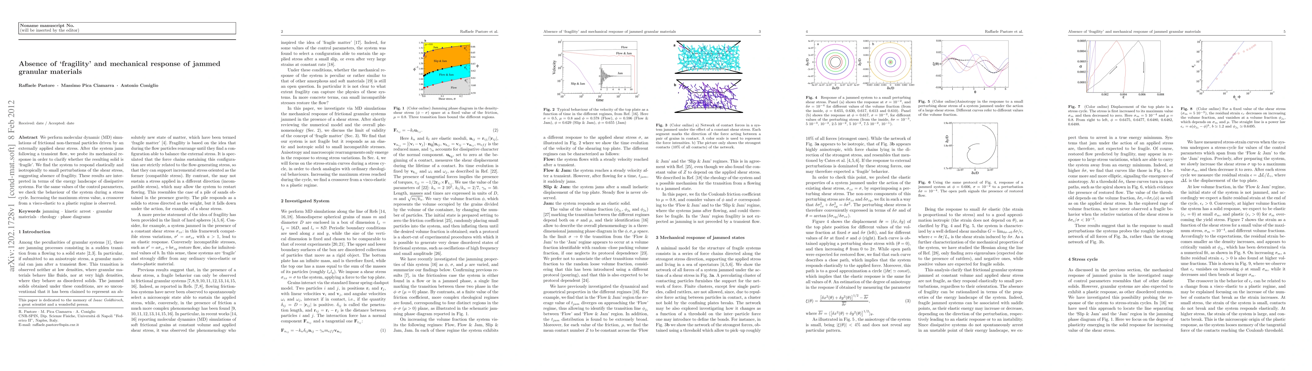 We perform molecular dynamic (MD) simulations of frictional non-thermal particles driven by an externally applied shear stress. After the system jams following a transient flow, we probe its mechanical response in order to clarify whether the resulting solid is 'fragile'. We find the system to respond elastically and isotropically to small perturbations of the shear stress, suggesting absence of fragility. These results are interpreted in terms of the energy landscape of dissipative systems. For the same values of the control parameters, we check the behaviour of the system during a stress cycle. Increasing the maximum stress value, a crossover from a visco-elastic to a plastic regime is observed.