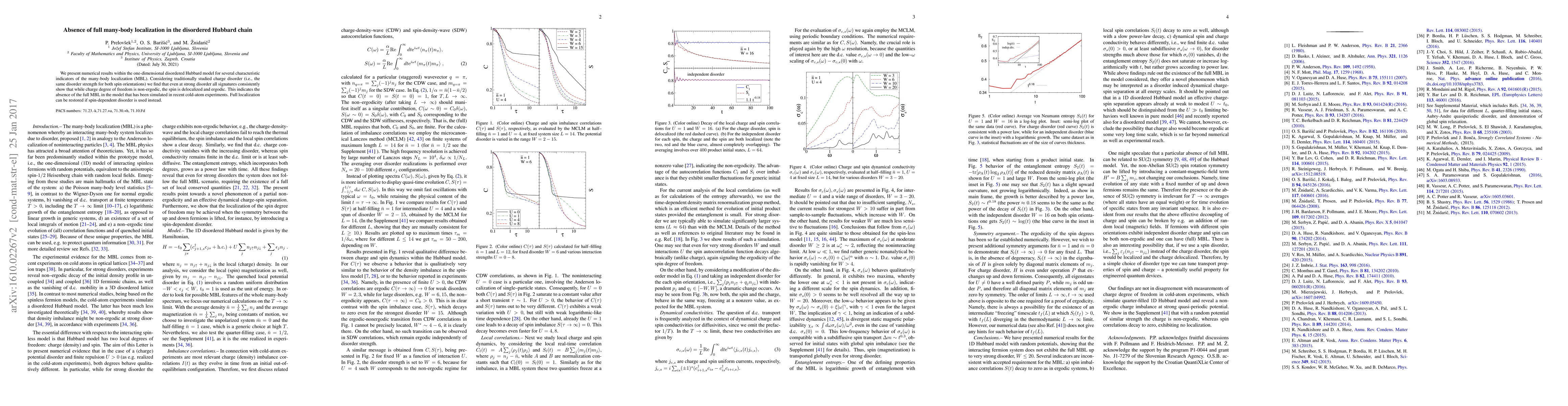 Summary: Numerical results in the 1D disordered Hubbard model show that while charge is non-ergodic, spin remains delocalized and ergodic, indicating the absence of full many-body localization under charge disorder. Full localization can be achieved with spin-dependent disorder.