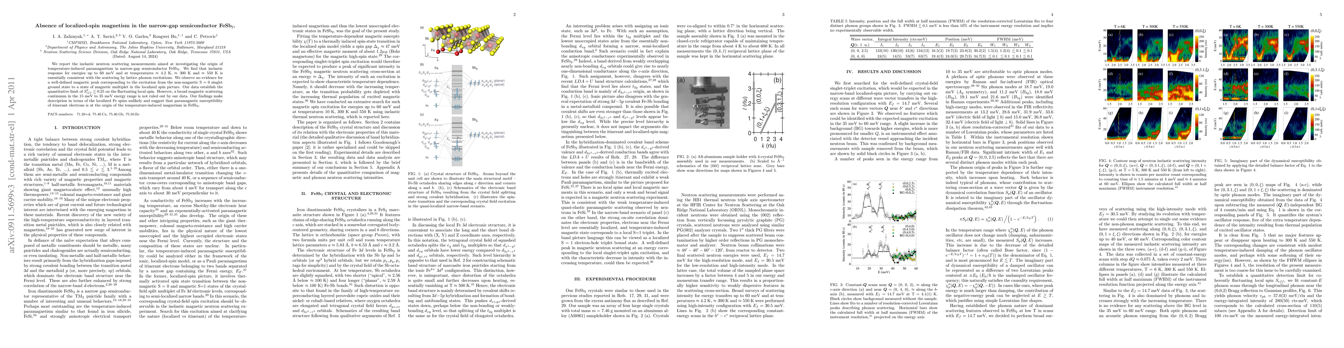 We report inelastic neutron scattering measurements aimed at investigating the origin of the temperature-induced paramagnetism in the narrow-gap semiconductor FeSb2. We find that inelastic response for energies up to 60 meV and at temperatures 4.2 K, 300 K and 550 K is essentially consistent with the scattering by lattice phonon excitations. We observe no evidence for a well-defined magnetic peak corresponding to the excitation from the non-magnetic S = 0 singlet ground state to a state of magnetic multiplet in the localized spin picture. Our data establish the quantitative limit of S_{eff}^2 < 0.25 on the fluctuating local spin. However, a broad magnetic scattering continuum in the 15 meV to 35 meV energy range is not ruled out by our data. Our findings make description in terms of the localized Fe spins unlikely and suggest that paramagnetic susceptibility of itinerant electrons is at the origin of the temperature-induced magnetism in FeSb2.