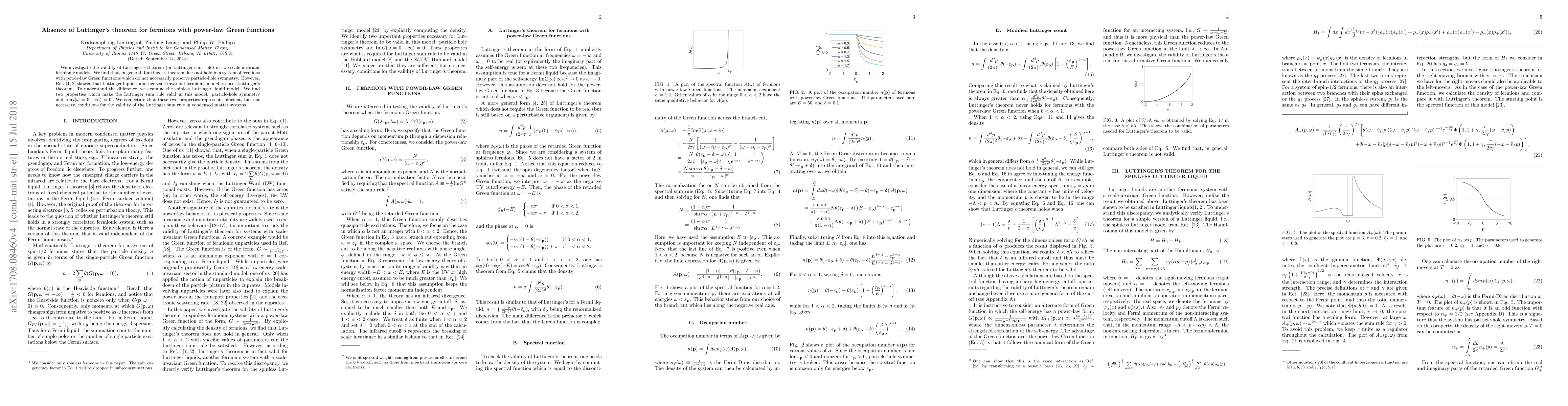 We investigate the validity of Luttinger's theorem (or Luttinger sum rule) in two scale-invariant fermionic models. We find that, in general, Luttinger's theorem does not hold in a system of fermions with power-law Green functions which do not necessarily preserve particle-hole symmetry. However, Ref. \cite{Blagoev1997,Yamanaka1997} showed that Luttinger liquids, another scale-invariant fermionic model, respect Luttinger's theorem. To understand the difference, we examine the spinless Luttinger liquid model. We find two properties which make the Luttinger sum rule valid in this model: particle-hole symmetry and $\mathrm{Im} G(\omega=0,-\infty)=0$. We conjecture that these two properties represent sufficient, but not necessary, conditions for the validity of the Luttinger sum rule in condensed matter systems.