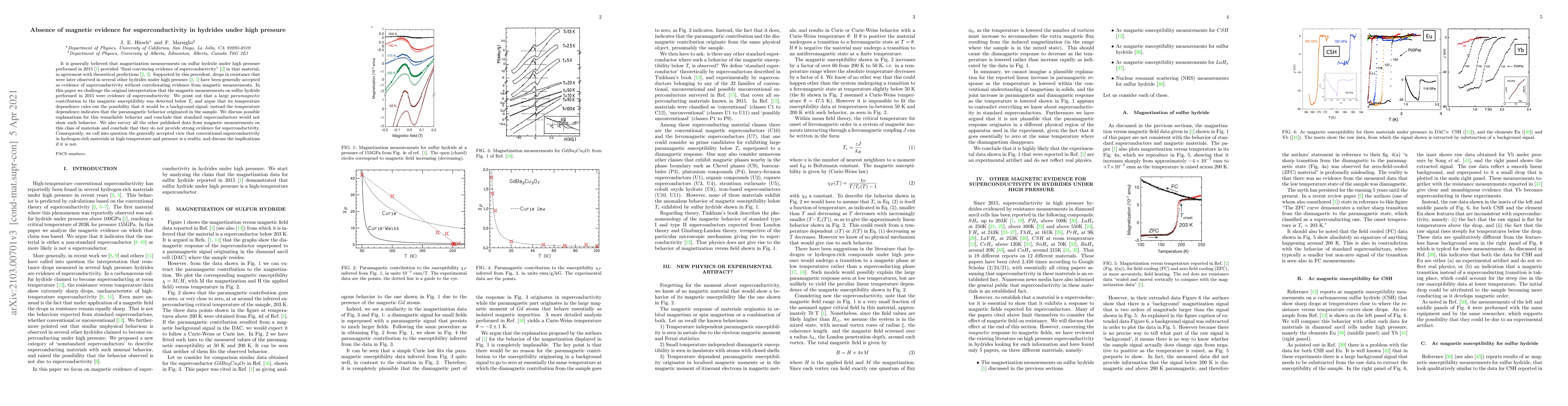 This paper challenges the 2015 interpretation of magnetization measurements on sulfur hydride under high pressure as evidence of superconductivity, arguing that a large paramagnetic contribution rules out this possibility. The authors survey additional magnetic data and conclude that it does not support conventional superconductivity in hydrogen-rich materials at high pressure.