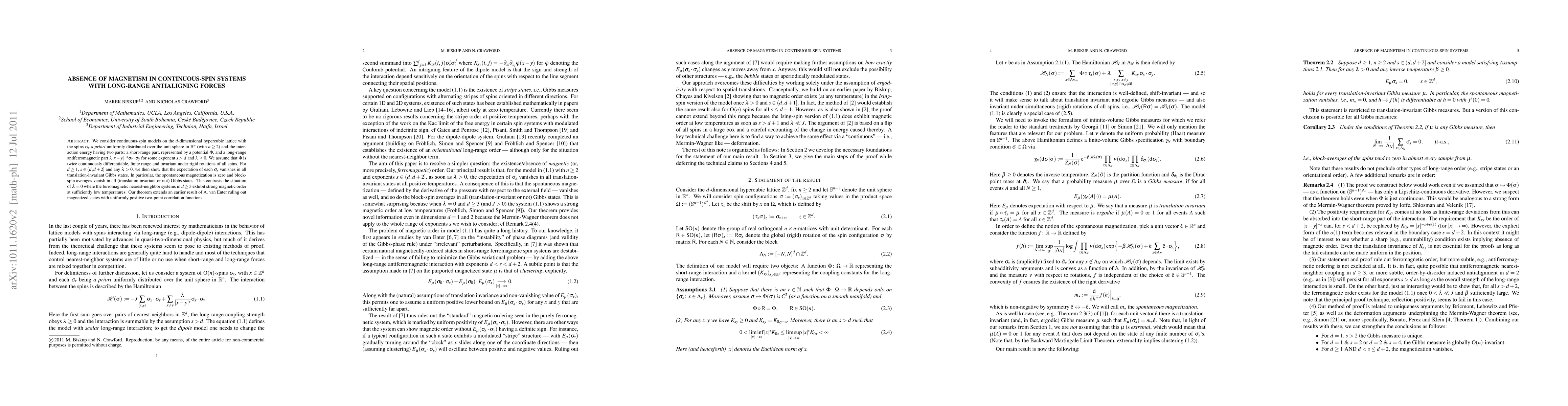 We consider continuous-spin models on the $d$-dimensional hypercubic lattice with the spins $\sigma_x$ \emph{a priori} uniformly distributed over the unit sphere in $\R^n$ (with $n\ge2$) and the interaction energy having two parts: a short-range part, represented by a potential $\Phi$, and a long-range antiferromagnetic part $\lambda|x-y|^{-s}\sigma_x\cdot\sigma_y$ for some exponent $s>d$ and $\lambda\ge0$. We assume that $\Phi$ is twice continuously differentiable, finite range and invariant under rigid rotations of all spins. For $d\ge1$, $s\in(d,d+2]$ and any $\lambda>0$, we then show that the expectation of each $\sigma_x$ vanishes in all translation-invariant Gibbs states. In particular, the spontaneous magnetization is zero and block-spin averages vanish in all (translation invariant or not) Gibbs states. This contrasts the situation of $\lambda=0$ where the ferromagnetic nearest-neighbor systems in $d\ge3$ exhibit strong magnetic order at sufficiently low temperatures. Our theorem extends an earlier result of A. van Enter ruling out magnetized states with uniformly positive two-point correlation functions.