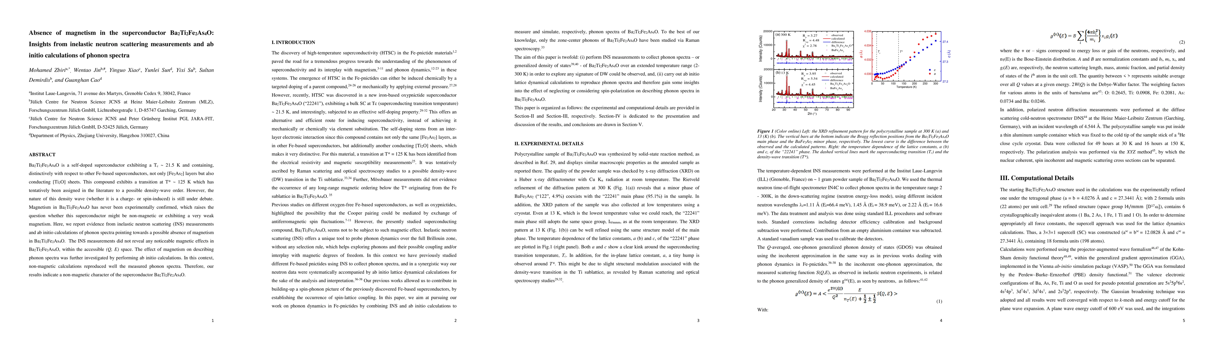 This research reveals that Ba2Ti2Fe2As4O, a self-doped superconductor with unique [Ti2O] sheets alongside [Fe2As2] layers, shows no evidence of magnetism based on inelastic neutron scattering and ab initio phonon calculations. These findings suggest the material is non-magnetic and unconventional in its superconducting behavior.