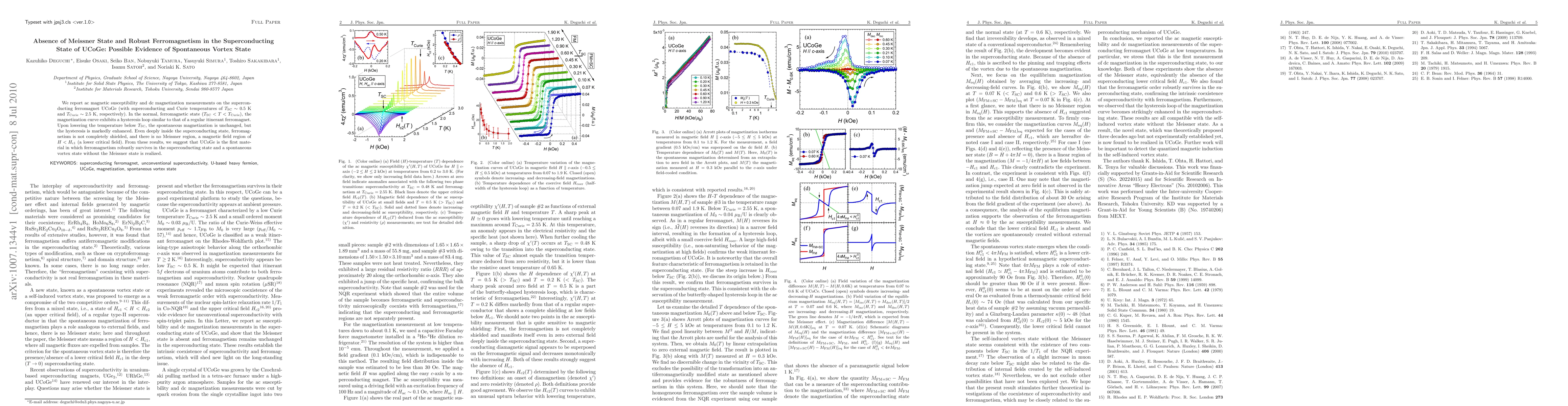 The paper presents ac magnetic susceptibility and dc magnetization measurements on UCoGe, a superconducting ferromagnet. Key findings include the absence of a Meissner state and robust ferromagnetism deep in the superconducting state, suggesting UCoGe is the first material to exhibit a spontaneous vortex state without a Meissner region.