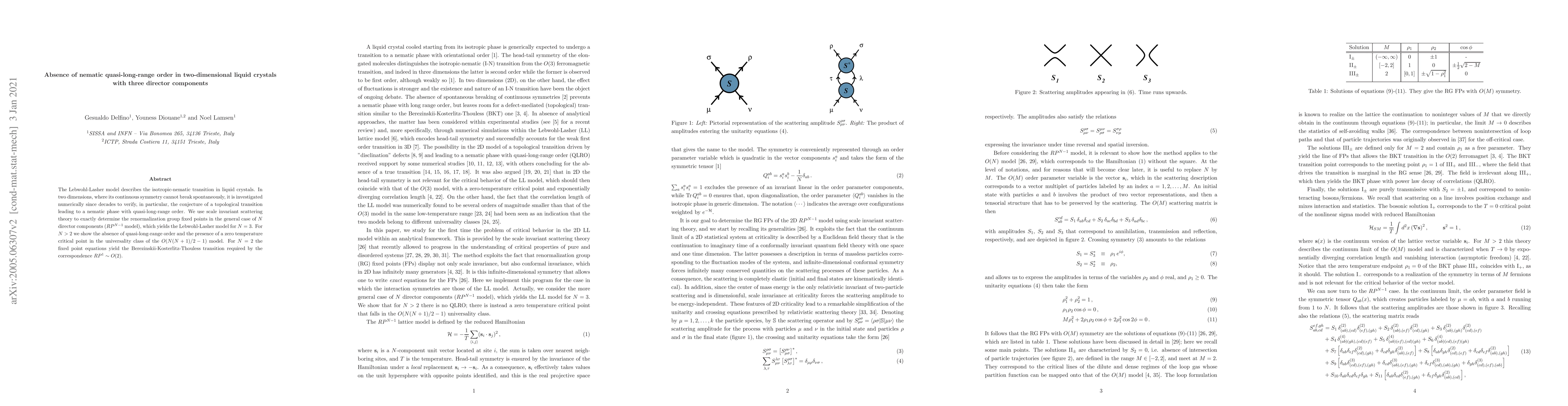 The Lebwohl-Lasher model describes the isotropic-nematic transition in liquid crystals. In two dimensions, where its continuous symmetry cannot break spontaneously, it is investigated numerically since decades to verify, in particular, the conjecture of a topological transition leading to a nematic phase with quasi-long-range order. We use scale invariant scattering theory to exactly determine the renormalization group fixed points in the general case of $N$ director components ($RP^{N-1}$ model), which yields the Lebwohl-Lasher model for $N=3$. For $N>2$ we show the absence of quasi-long-range order and the presence of a zero temperature critical point in the universality class of the $O(N(N+1)/2-1)$ model. For $N=2$ the fixed point equations yield the Berezinskii-Kosterlitz-Thouless transition required by the correspondence $RP^1\sim O(2)$.