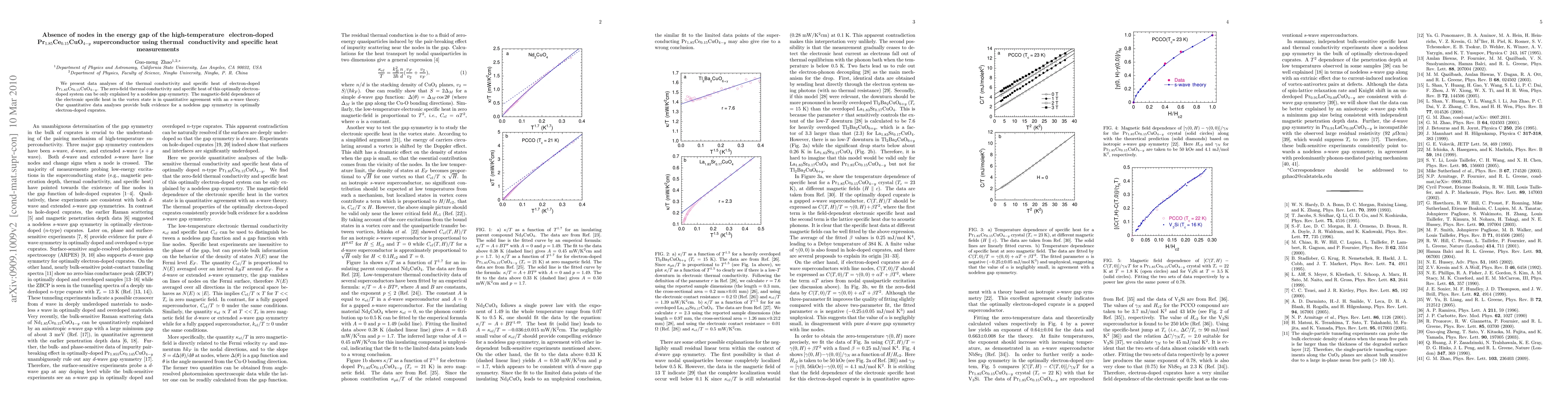 This study analyzes thermal conductivity and specific heat in electron-doped Pr1.85Ce0.15CuO4-y, revealing a nodeless gap symmetry in the superconducting energy gap. The findings support s-wave pairing and provide strong evidence against nodes in the gap of optimally doped cuprates.