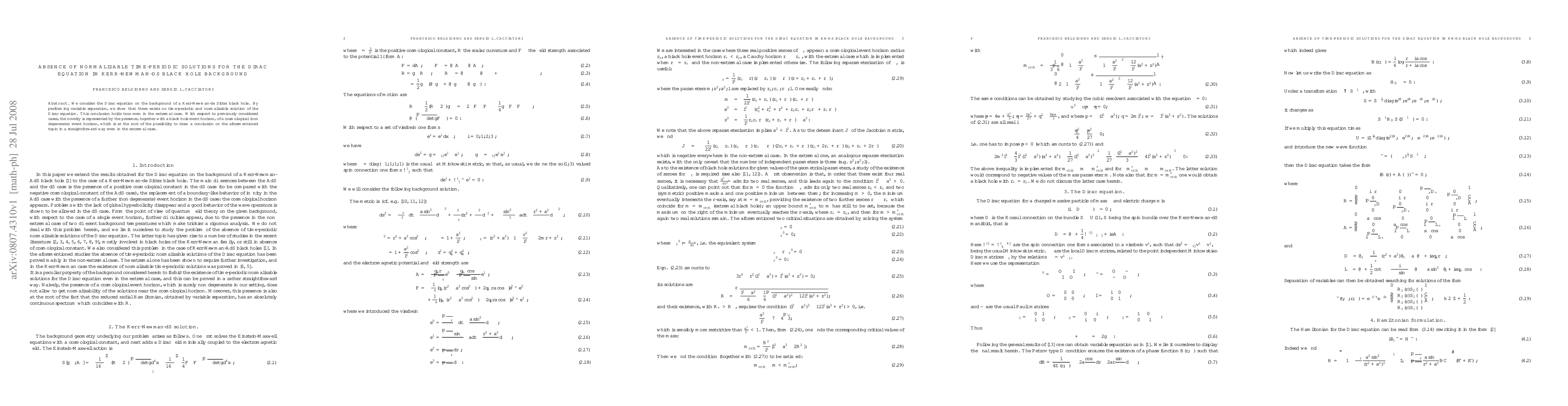We consider the Dirac equation on the background of a Kerr-Newman-de Sitter black hole. By performing variable separation, we show that there exists no time-periodic and normalizable solution of the Dirac equation. This conclusion holds true even in the extremal case. With respect to previously considered cases, the novelty is represented by the presence, together with a black hole event horizon, of a cosmological (non degenerate) event horizon, which is at the root of the possibility to draw a conclusion on the aforementioned topic in a straightforward way even in the extremal case.