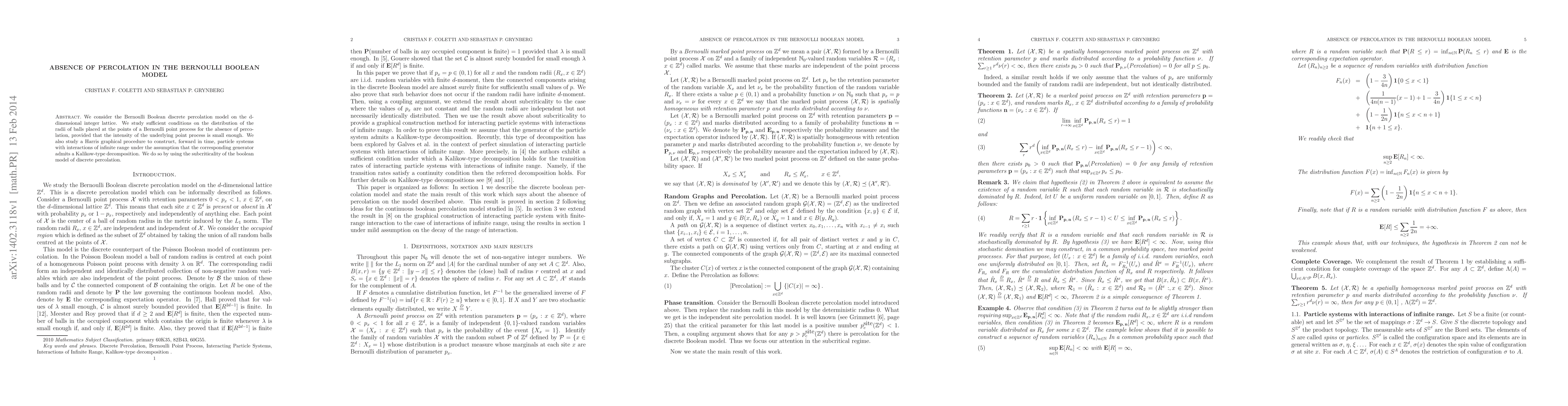 This paper investigates the Bernoulli Boolean discrete percolation model on a d-dimensional lattice, focusing on conditions that prevent percolation when the point process is sufficiently sparse. It also explores a Harris graphical procedure for constructing particle systems under infinite-range interactions, leveraging the subcriticality of the boolean model.