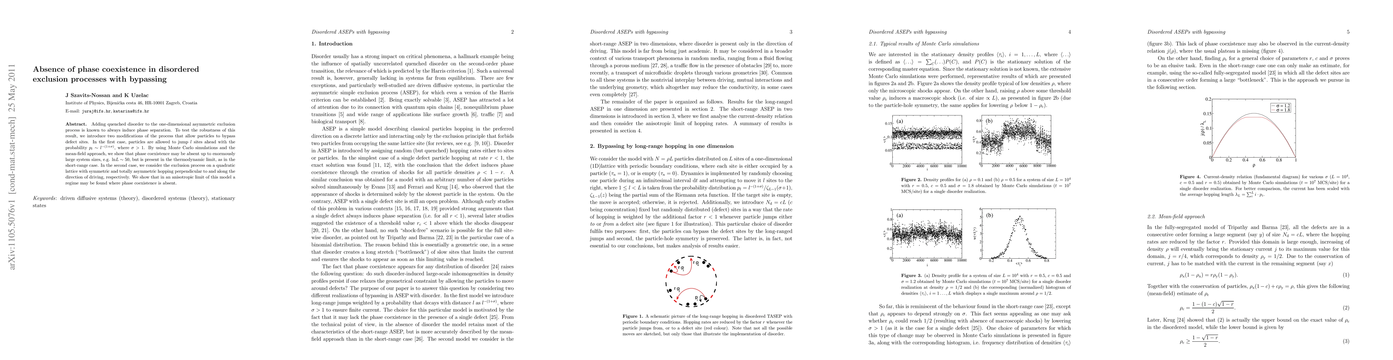 Adding quenched disorder to the one-dimensional asymmetric exclusion process is known to always induce phase separation. To test the robustness of this result, we introduce two modifications of the process that allow particles to bypass defect sites. In the first case, particles are allowed to jump l sites ahead with the probability p_l ~ l^-(1+sigma), where sigma>1. By using Monte Carlo simulations and the mean-field approach, we show that phase coexistence may be absent up to enormously large system sizes, e.g. lnL~50, but is present in the thermodynamic limit, as in the short-range case. In the second case, we consider the exclusion process on a quadratic lattice with symmetric and totally asymmetric hopping perpendicular to and along the direction of driving, respectively. We show that in an anisotropic limit of this model a regime may be found where phase coexistence is absent.